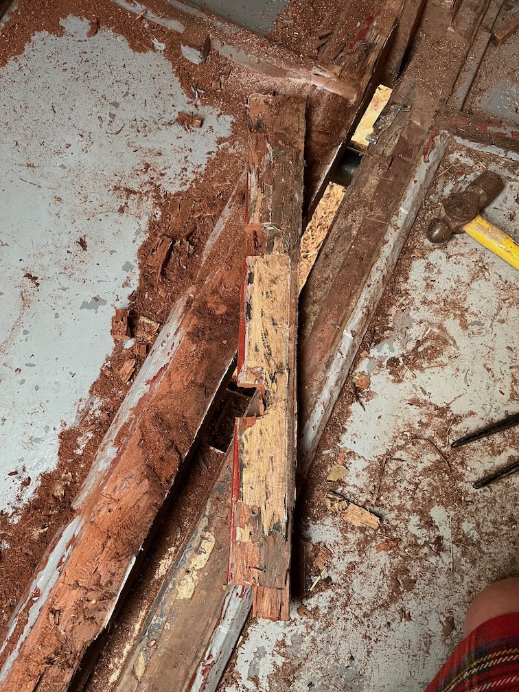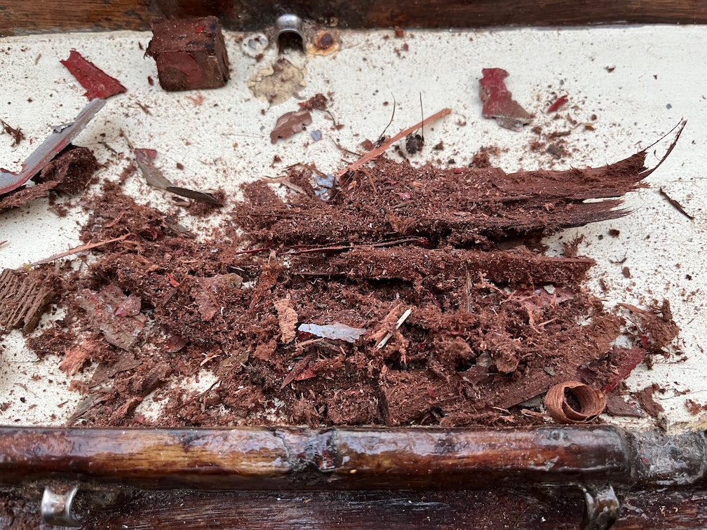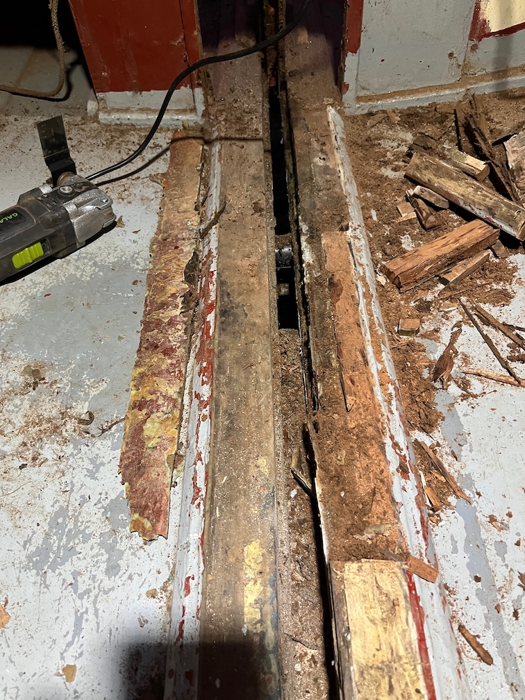 Although completing the removal of the port side of the centerplate case is a major milestone, the remaining tasks to do this are small. I did not need to remove the curved section of wood on the starboard side of the mast step as the already exposed inner veneer of the original plywood is quite firm, so I put a new blade in the multi-tool and set to.