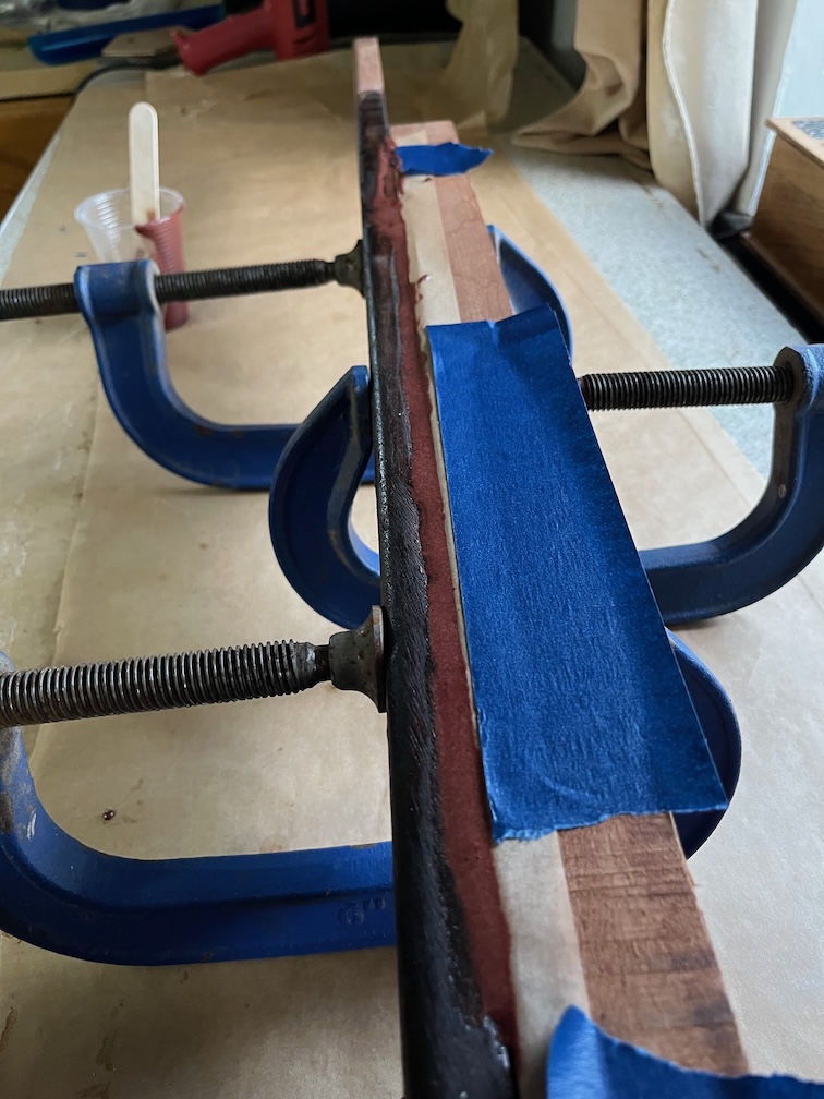 The screw holes that will hold the runner to the keel were drilled first and then the holes through the case side and into the runner. The aft end needed some persuasion to bend around the curve, hence all the gramps. Finally, the case side was brought into the house and leant up against the Rayburn to get warm.