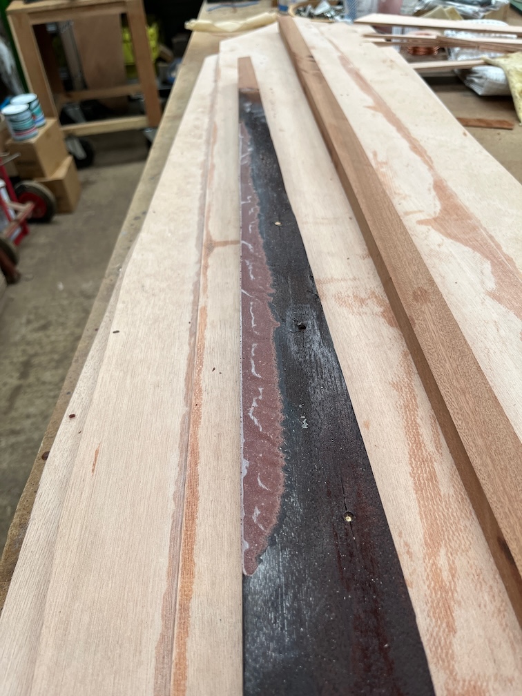 The next task in the list it to make the new bottom runner for the port side. This was fairly straightforward, I had a piece of Sapele cut roughly to size and this just required cutting to a bit longer than required, the ends trimmed to match the old runner still left on the keel and then checked for fit. It needed to be reduced in height about 1mm and the upper corner that meets the side was chamfered.