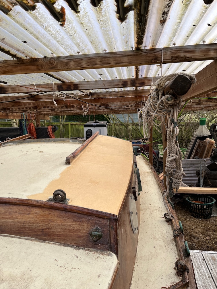 The weather has been reasonably warm and by early afternoon the humidity had dropped, so I scraped and sanded the hatch runners and applied a coat of varnish. If the weather holds I should be able to get another coat on tomorrow afternoon.
