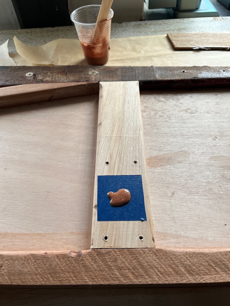 All the Mahogany in this area with the exception of the two mid-brown pieces, is wet and fibrous indicating that this has been wet for a long time, like the plywood of the case sides. It is still wet as there is nowhere for the water to get out. Paint on the outer parts and glued plywood on the inner sides.