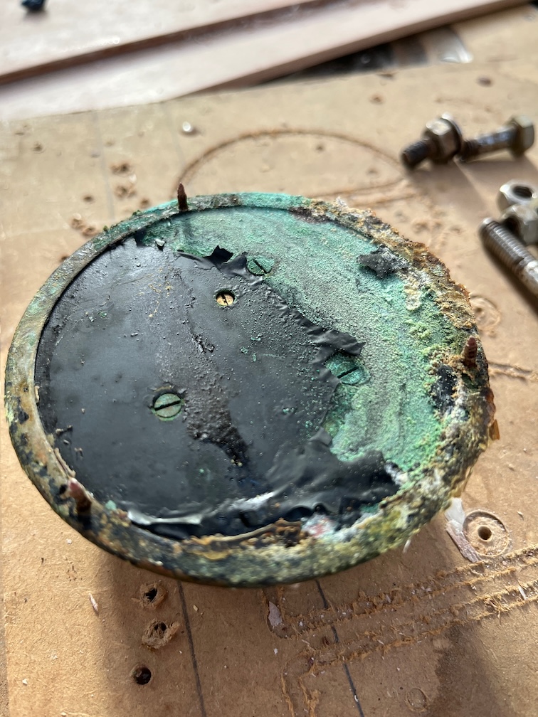 Now, the question in my mind at this time is whether the water has got in from the inside of the centerplate case as is it has for the damaged plywood, or whether the water has got in from the outside, namely the cockpit. The footwell does collect water, mostly fresh from rain, so this is not so strange as it might sound.