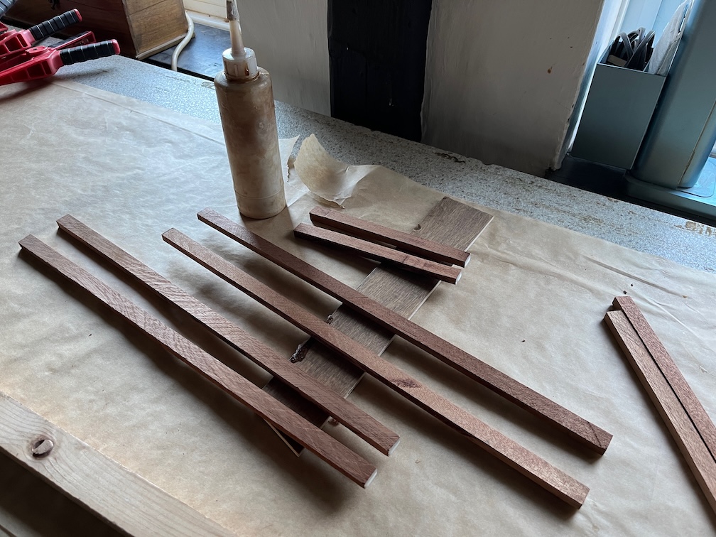 This looks like a right mess at first glance. It is the remains of the uppermost runner at the stern of the case which seems to be made of Mahogany whereas the rest of that runner seems to be Ash. You can see the colour difference at the bottom of the photo. There is a dark section of wood with two lighter brown pieces beside it and below those in the photo the wood turns a light brown, almost beige. This is the Ash.