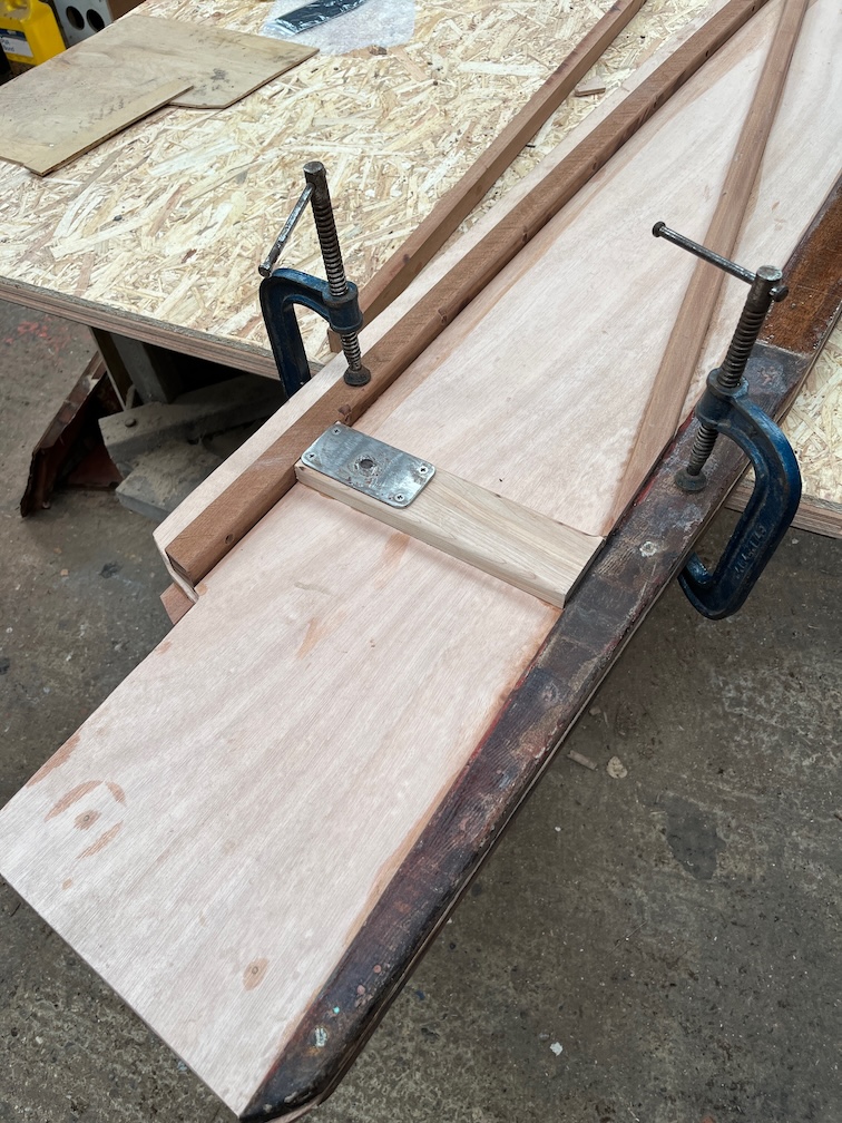 Mark the position of the brace, drill holes through the side, clamp the brace in place and drill into the brace from the other side and chamfer the holes. Then glue it all together. Then I started shaping the ends to meet the runners and realised that I had made a critical error. The brace was the wrong way round !!