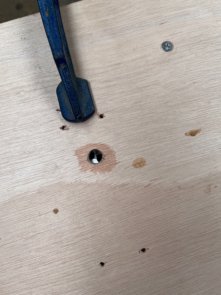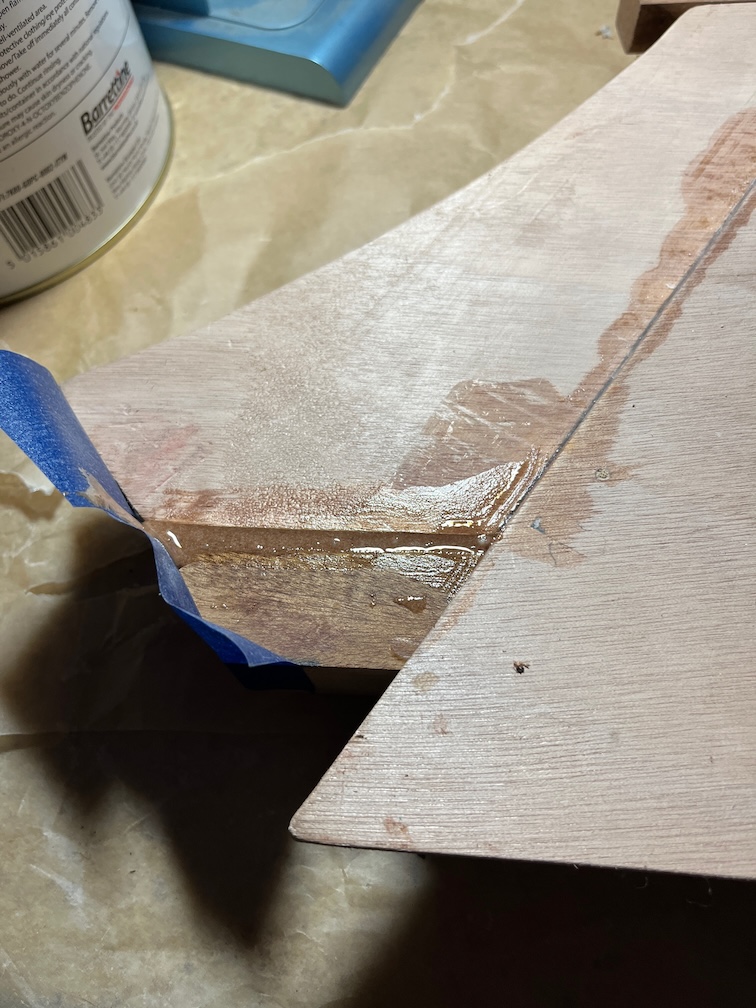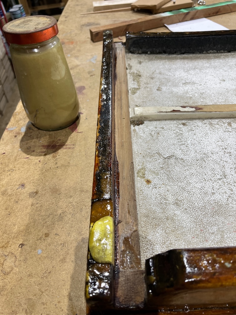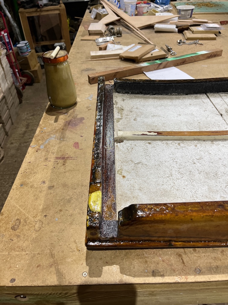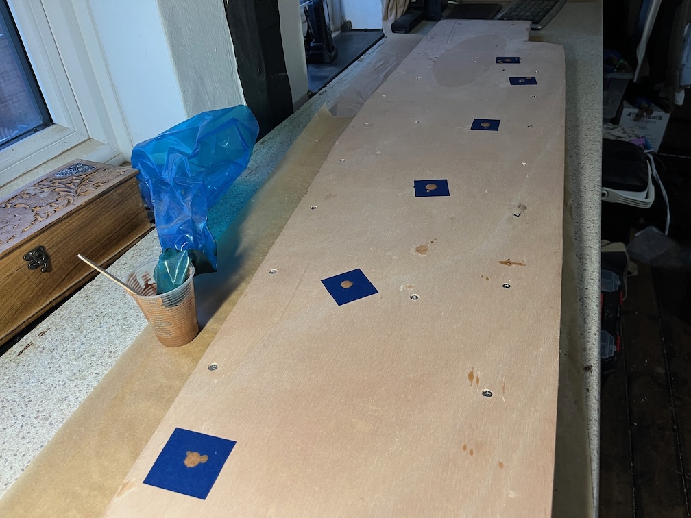 One I had consumed the tea I took the port side into the workroom, drilled out the errant screw holes to 12 mm, put squares of blue painter’s tape on both sides of each hole, making sure that the tape was pressed down firmly, then cut the tape on the top side to reveal the holes. The sprung section had tape put on the underside. Into these holes I put epoxy thickened with low density filler mixed to the consistency of double cream. I want it to flow into all the holes and fill them up without me having to press the epoxy in with a putty knife.