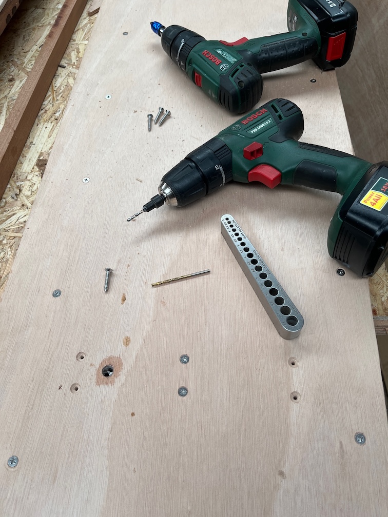 Two of the holes were drilled and countersunk, then screws put in place to hold the support whilst the remaining four holes were drilled, countersunk and screws fitted. I use a vertical drill guide to make sure that the holes are drilled, well, vertically to the workpiece. I also drilled out the bolt hole to 13mm as was done before for the starboard side back on 1st January.