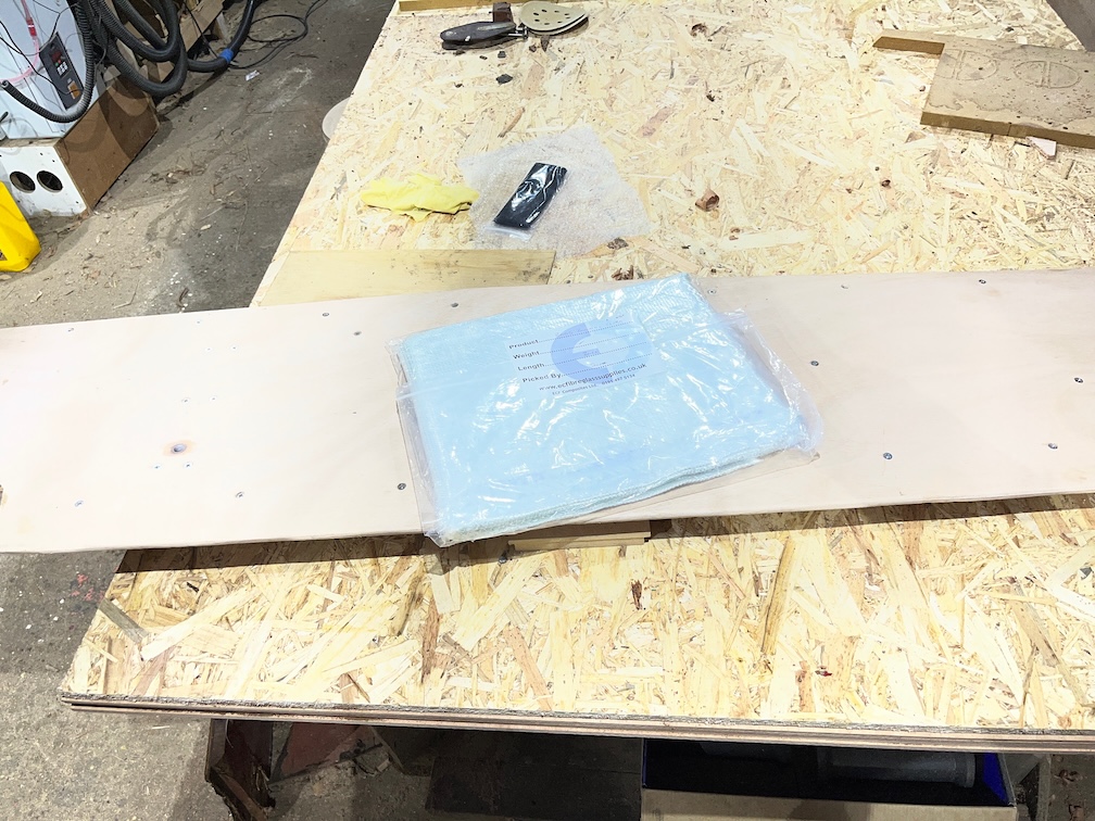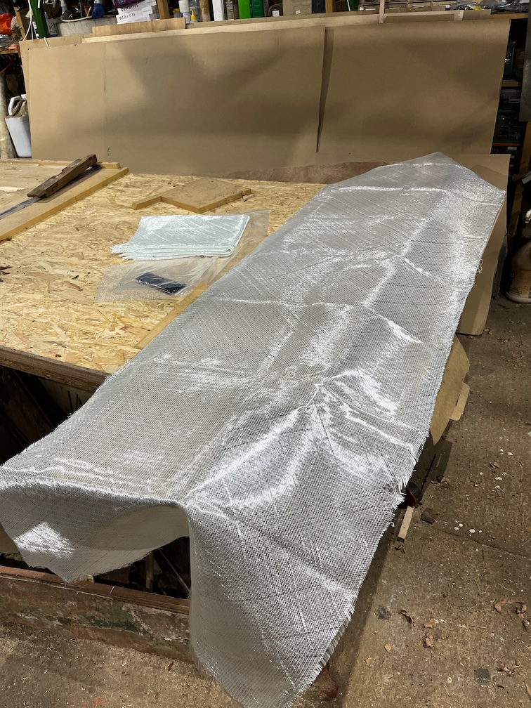 The last task for today, I’m having a ‘rest’ day and not doing that much, is to cut the glass mat. I bought 2m of 1.27m wide 300g biaxial glass cloth and it needs to be cut in half.