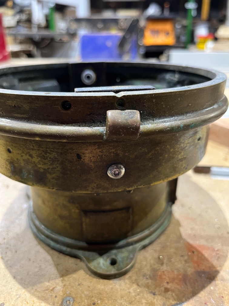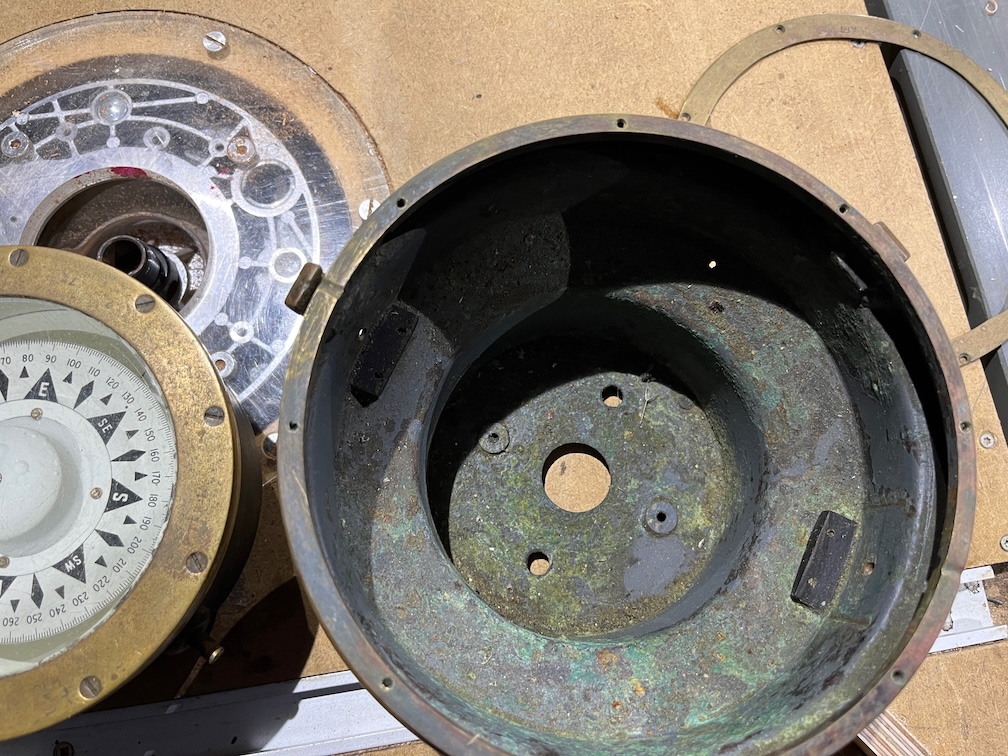 Here is the compass disassembled. Originally, before being installed in Shoal Waters the compass gimballed in all axes, but Charles removed the fore and aft gimbal so that it just gimbals side to side.