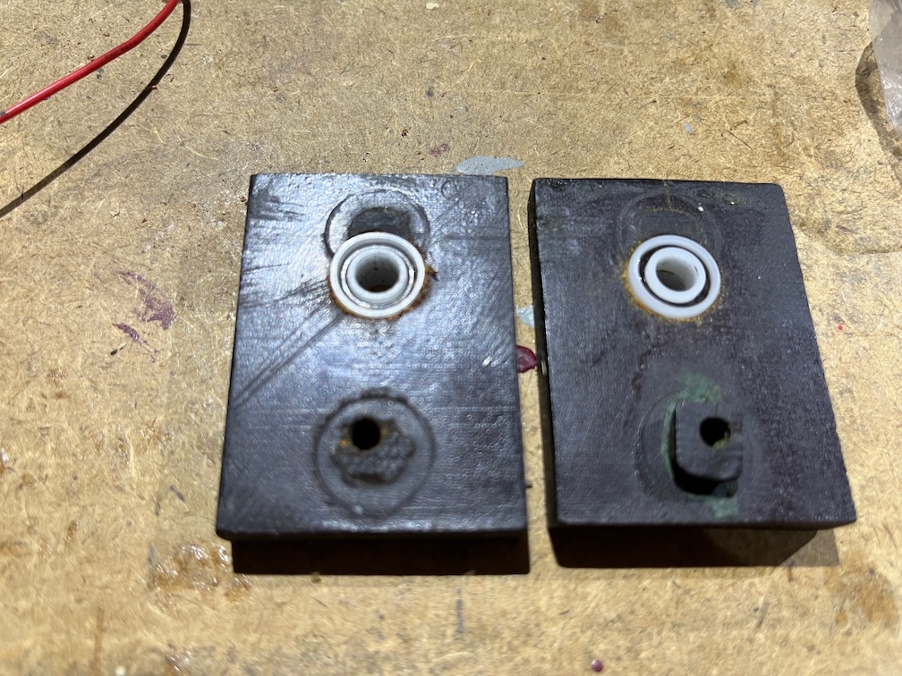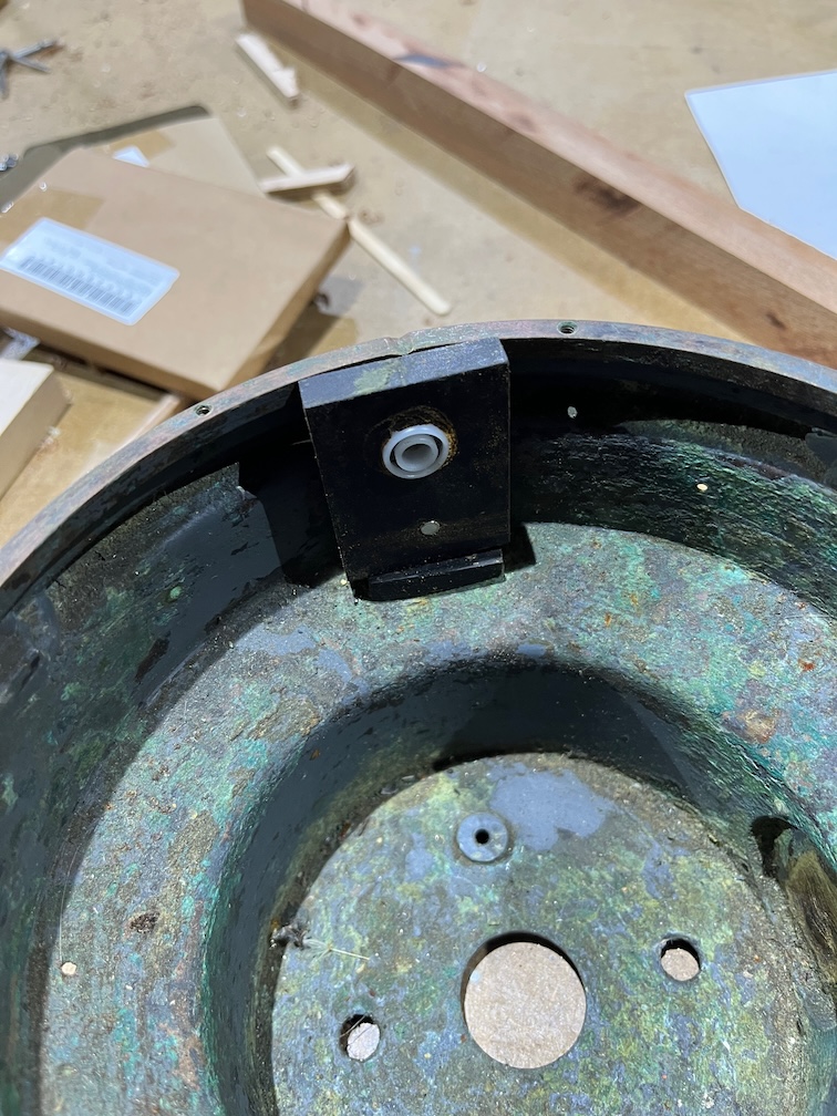 The Bakelite bearing supports rest on two flat Bakelite pieces screwed to the outer housing and held in place by screws from the outside. These, being brass, had started to soften so I’ve ordered some more, but M5 bolts this time.