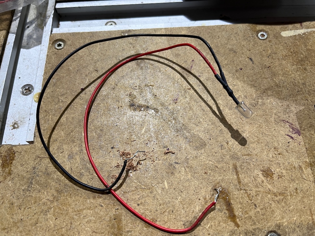 So this is the way I’m going right now. This is the underside of the LED mount with the LED and the wires held to the wood with hot glue.