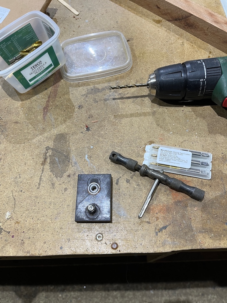 The holes in the Bakelite bearing supports were drilled out to 4.2mm and them tapped with a 5mm tap.