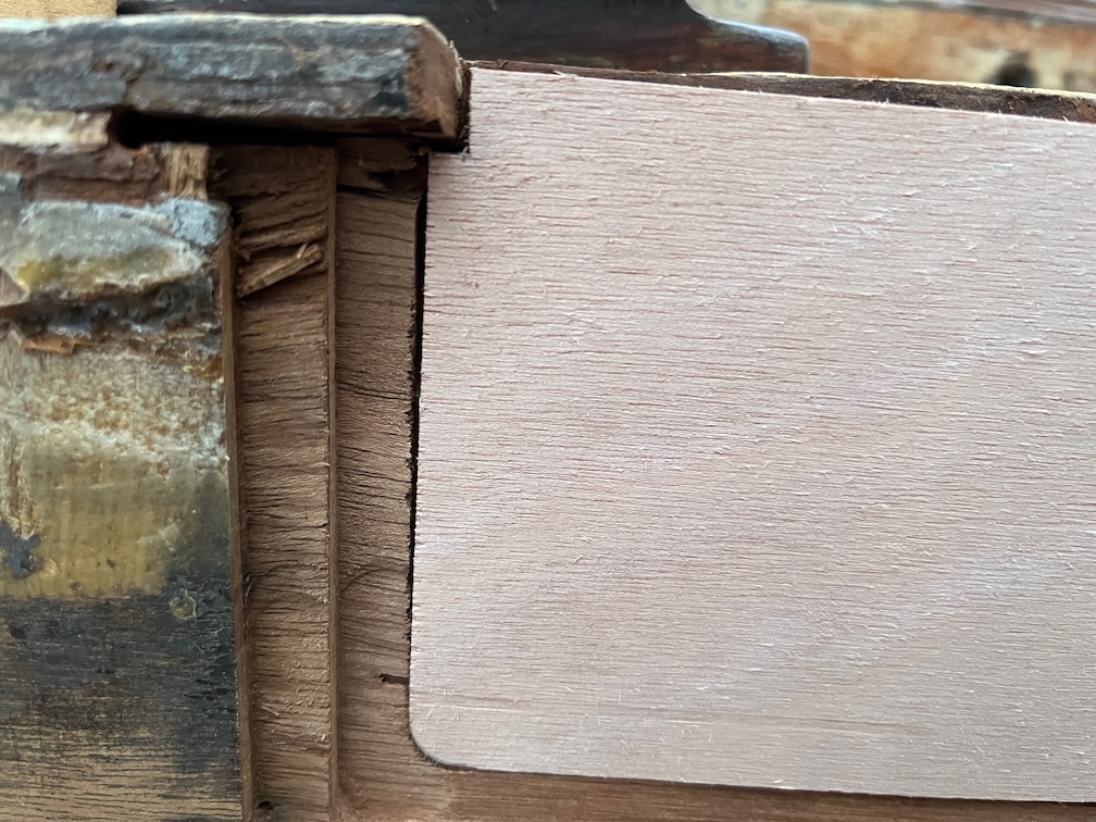 The next task was to get the laminates for the transom repair made, starting with the outermost. As this is the face that will be seen, it needs to be as perfect as possible. Grain going in the same direction as the wood surrounding it and with as few gaps around the edges as possible. This is not difficult, it just requires a bit of to and fro as you dial the size in to fit exactly. I normally cut the piece about 1mm too large, offer it up the the gap and cut off fractions until it fits exactly.
