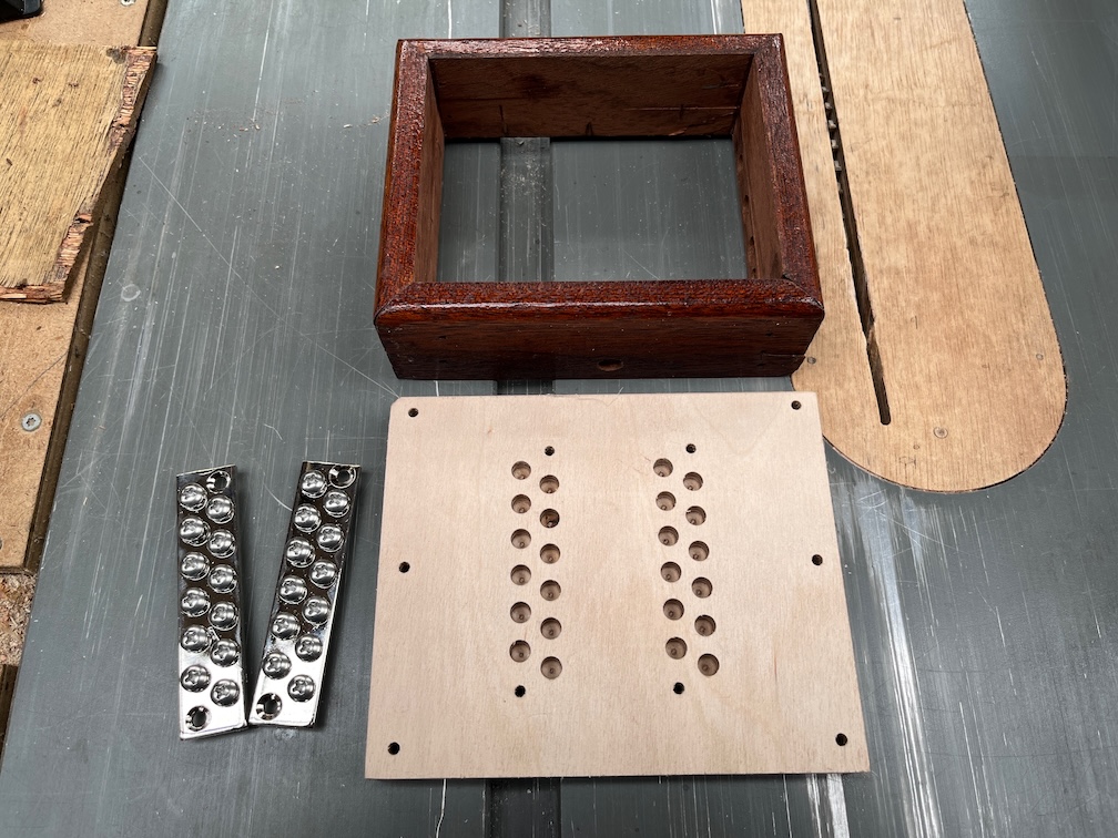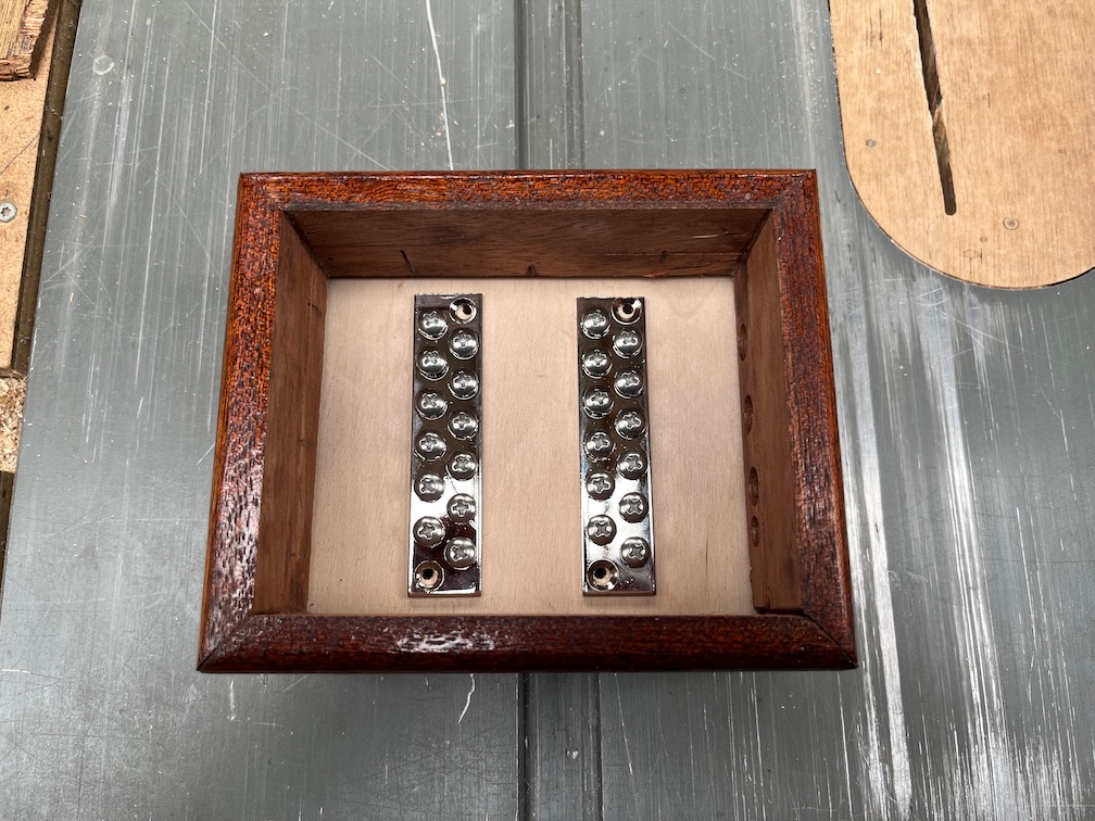 The back plate has been stained with two coats of a dark stain, like the charge connector back plate, and one coat of varnish has been applied. Both the back plates are made from Baltic Birch plywood which is a high quality plywood, but not intended for exterior use without treatment as the glue holding the veneers together is not waterproof.