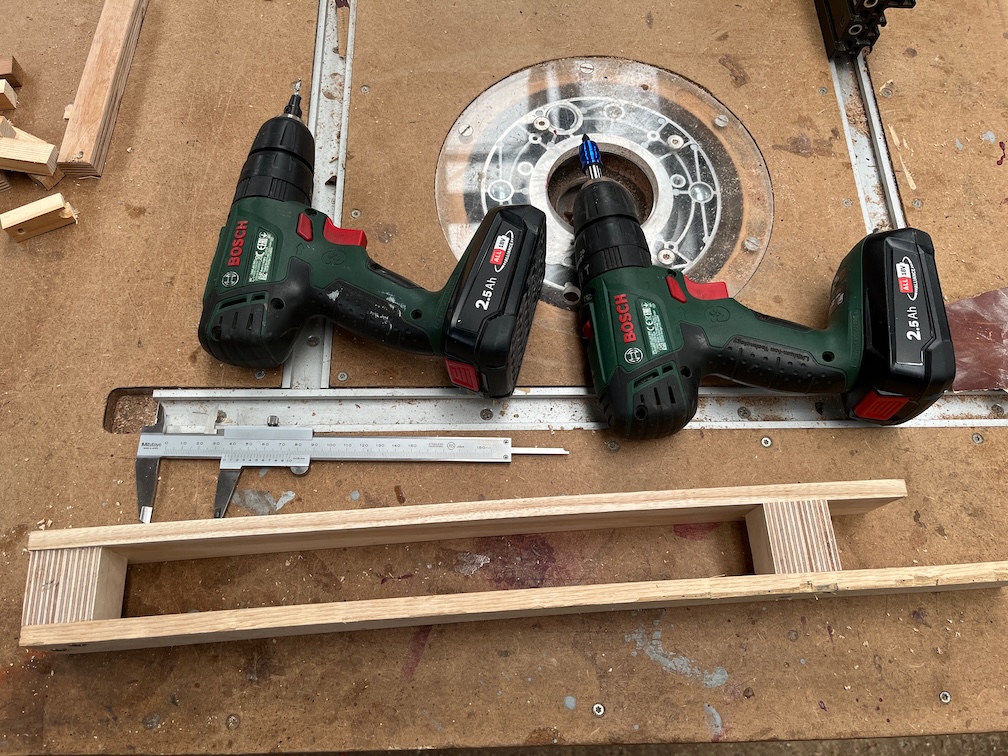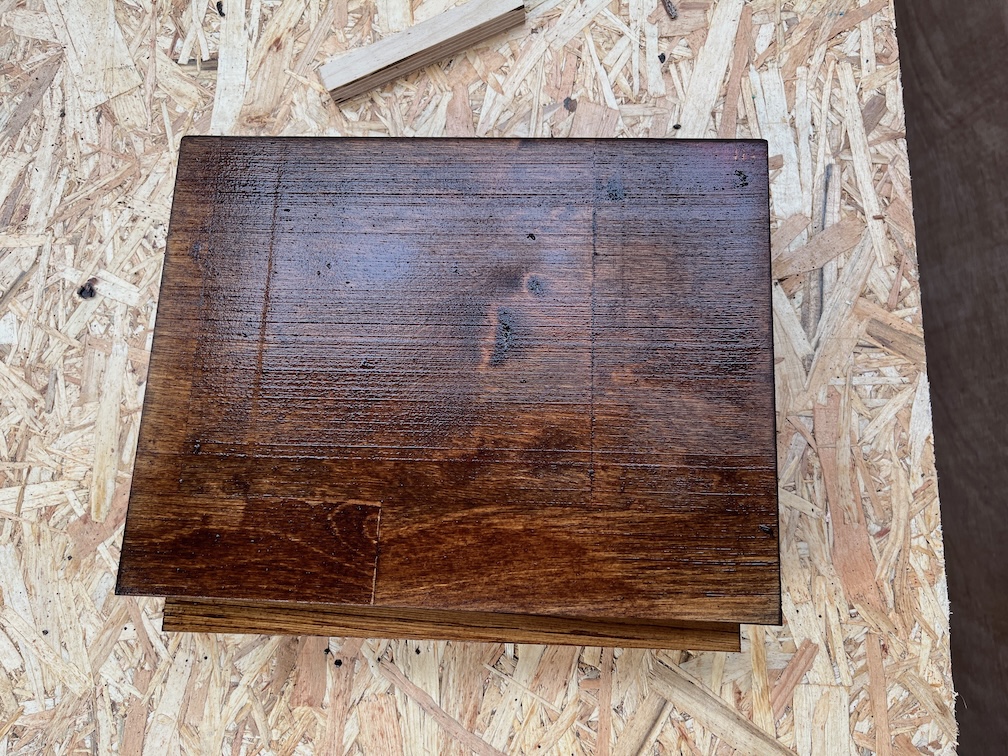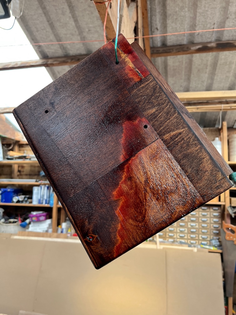 Very easy to make there’s no glueing or awkward bits and the result here has a coat of stain on both sides. I’m using some trapezoidal standoffs to keep of off the work surface.