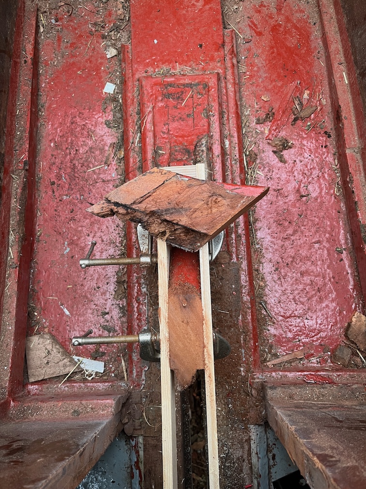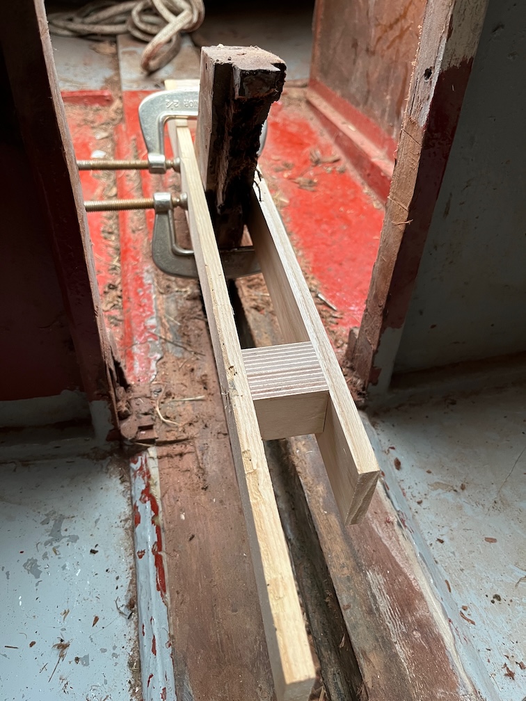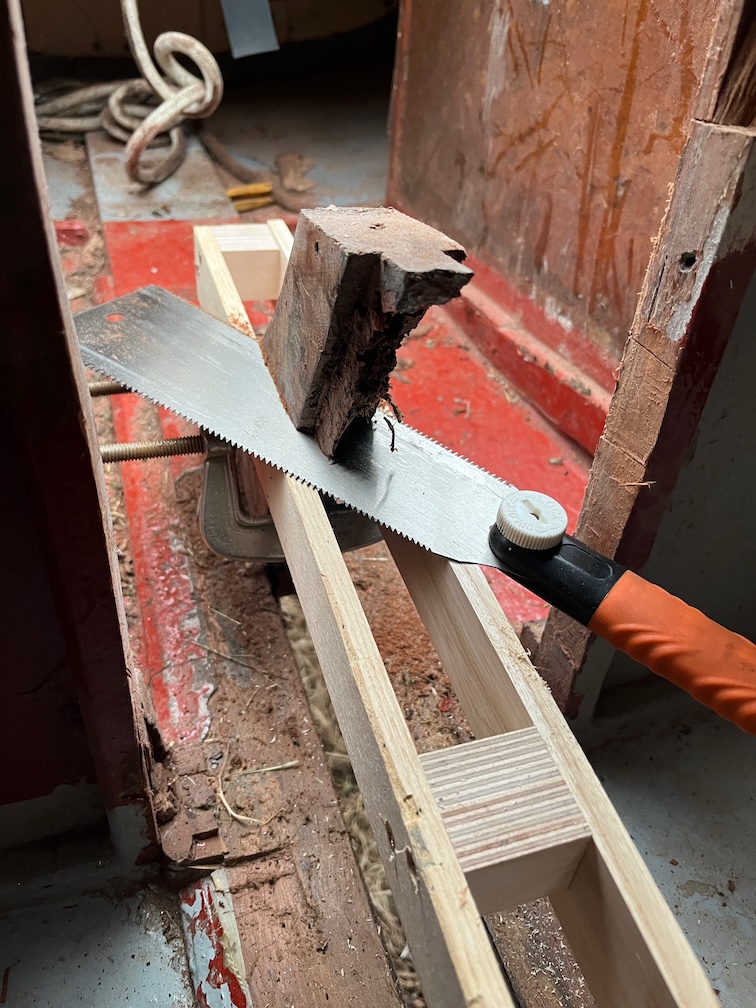 The next task on the list was to make a saw jig for the aft case bock so that the rotten/soft section could be sawn off by hand with as smooth and flat a cut as possible. The problem is that the space was sufficiently restricted so as to prevent the use of either a circular saw or a jigsaw, or at least the ones I own, and also all my hand saws with the exception of the pull saw. This blade is very flexible and to get an accurate, flat cut in such a tight space required a jig.