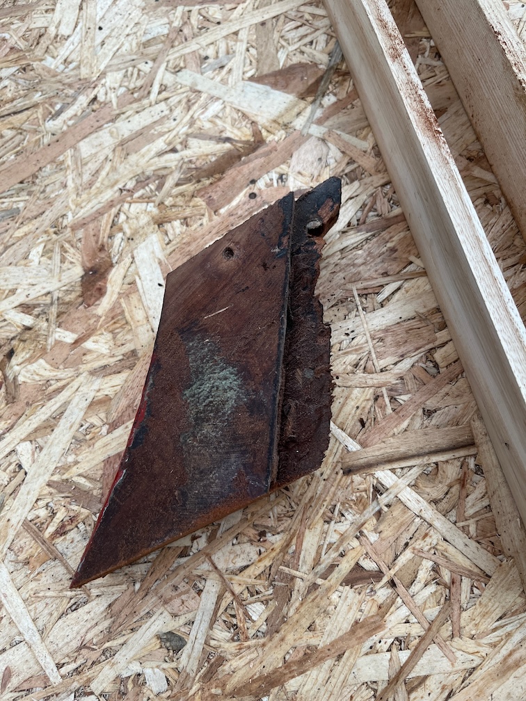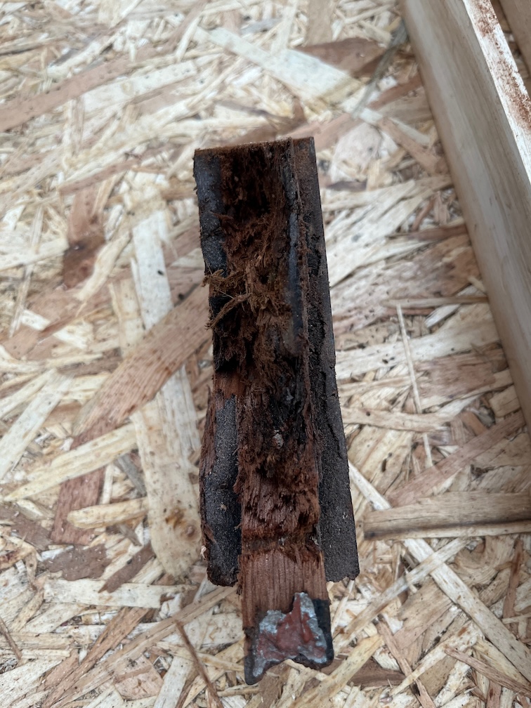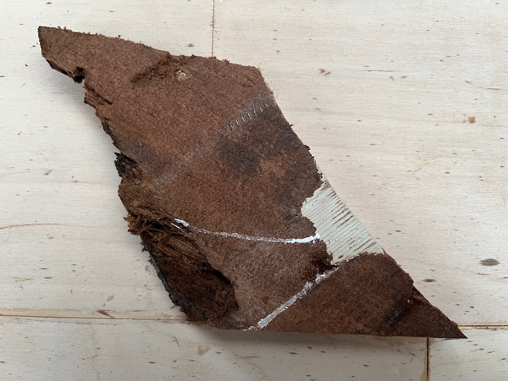 The soft, and possibly rotten, part doesn’t really extend into the body of the offcut except in one place. There are two holes that have been filled with some kind of filler, one a screw hole and the other a larger void for something.