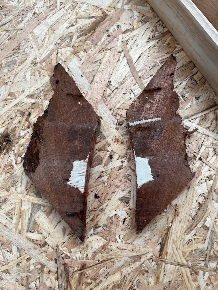 Here’s the interesting thing. Poking around the soft area I found that the really obvious soft wood was joined to the larger of the filled in sections. I’ve marked that soft section in white. The inner surfaces of the centerplate case were coated with a waterproof glue, including the fore and aft blocks, so unless the glue layer was damaged then the softness was unlikely to start from the inside, especially since that part of the block is above the waterline most of the time.