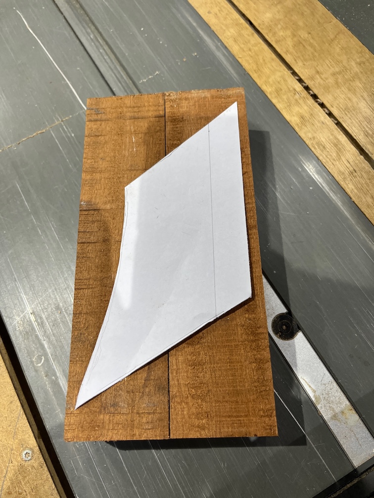 The paper template was cut out and I used it to see if I had any pieces of Sapele that would be big enough. Sadly not and two pieces were cut out and glued together.