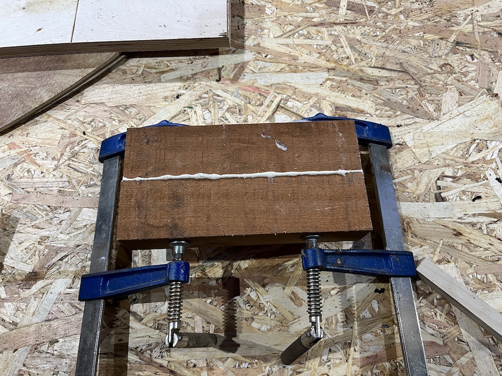 The thickness of the Sapele is 44 mm (ish) and the aft block is 37.7 mm, probably 1 1/2″ that has been sanded down. I will run this block through the planer once the glue has dried to get it to 38 mm and smooth on both sides instead of the rough sawn finish that you can see here.