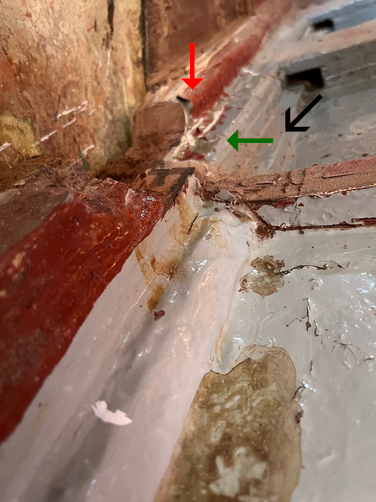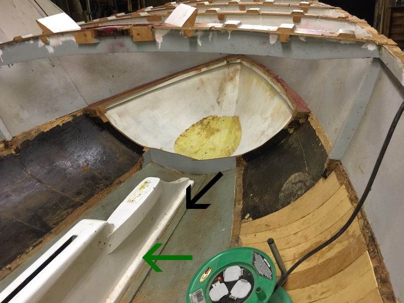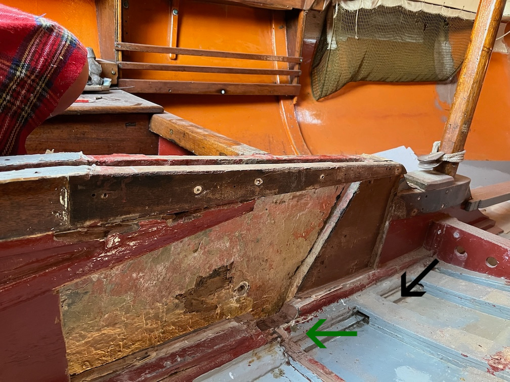 Here’s what I mean. The black arrow points to the top of the keel, the green arrow points to the first rounded bit, equivalent to the one in Naiad and the red arrow points to the extra one. Now, was this original or put in by Charles Stock or Tony Smith? I don’t know but I need to find out how far down the plywood goes so that I can cut away the plywood but nothing else.