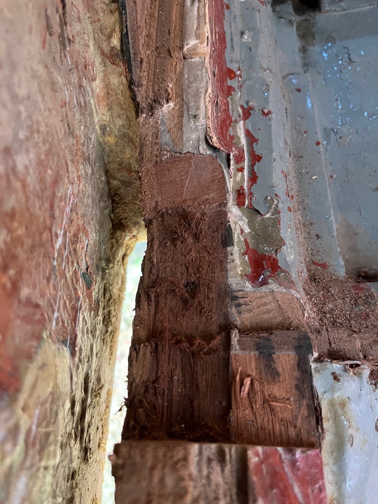 In the above photo you can see where I have cut more of the side of the case away and exposed the diagonal end block. I think I have left just one veneer of the plywood on this block and it was very difficult to remove indicating that the plywood here was in good condition. I removed as much as I did so that the new sides will have a significant overlap and therefore a very good seal when it is installed.