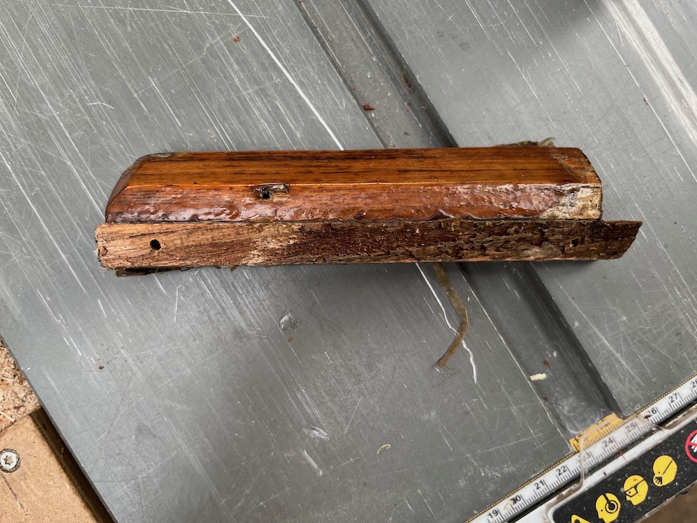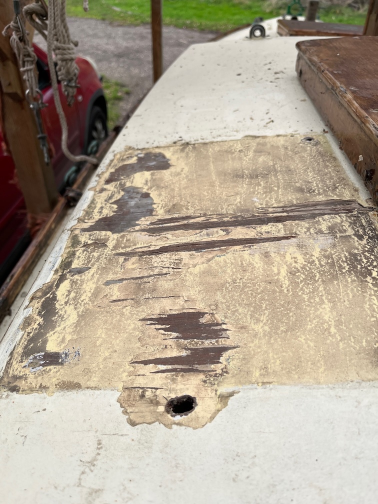 Whilst I was in the cockpit I took a look at the cabin top. I had scraped off all the loose paint that I found under the old solar panel last night but it was close to being fully dark at the time so I was unable to take a photo. Here the wood has had a chance to dry and although there is some slight damage to the surface, there is no rot. Good news here.