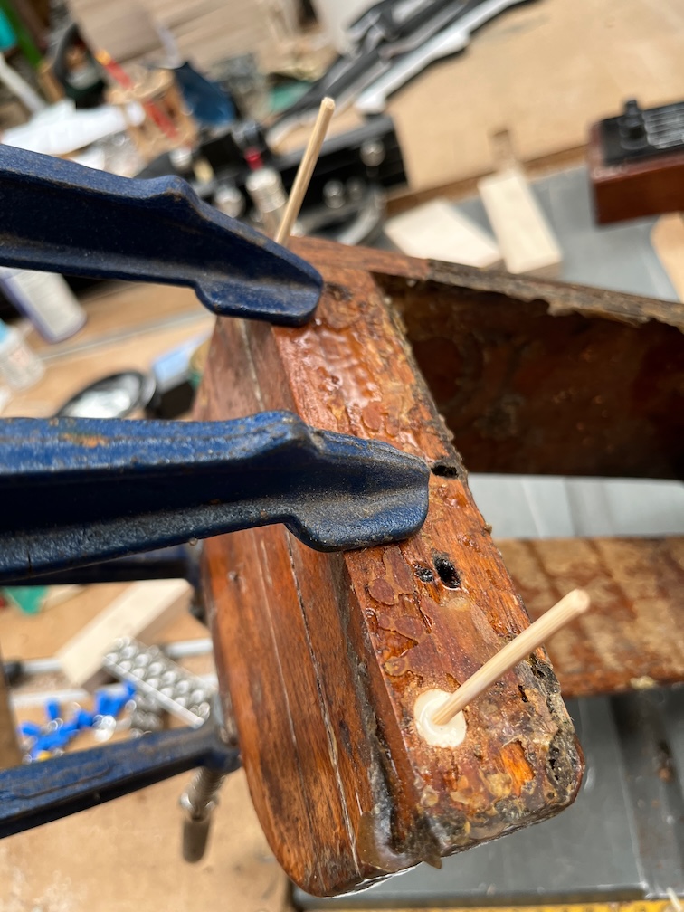 I sanded the break, drilled two holes for bamboo pins and glued the pieces back together. The reason for the bamboo pins is that I don’t have sufficiently long screws of either bronze or stainless steel that are M3 in size and I’m not about to buy some when the pins will do the job. I’m also not going to put in steel screws, which I do have of sufficient dimensions, as these will eventually rust and split the rack apart.