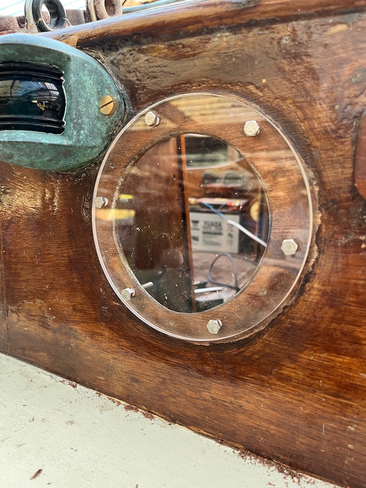 I remove one of the old lights, scraped away the old sealant, drilled bolts holes through the old screw holes and put one of the replacement lights in place. I don’t have the correct bolts for this job, they are on order, so I just used some bolts that are too long to check how it looks.