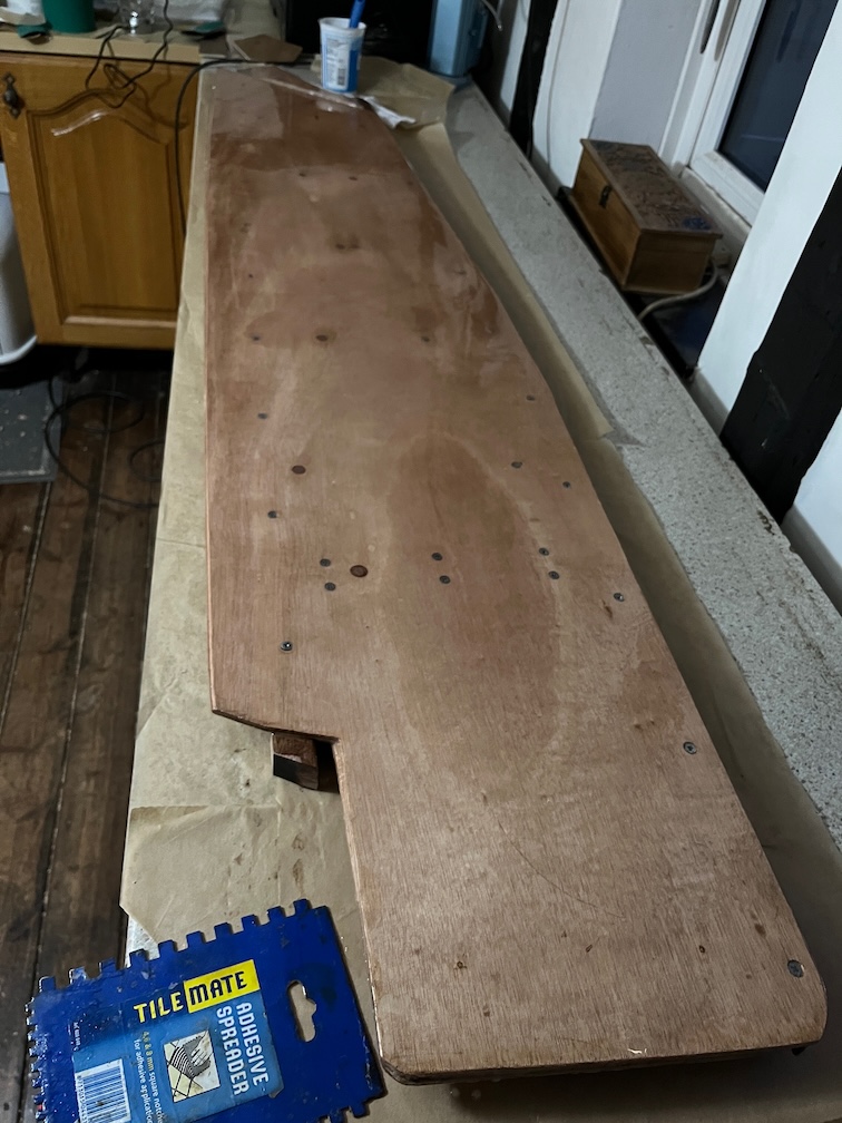 This has to be left for 24 hours or so to achieve full strength and then I will take it down to the workshop and trim the edges of the glass mat. After that it will be the turn of the other side.