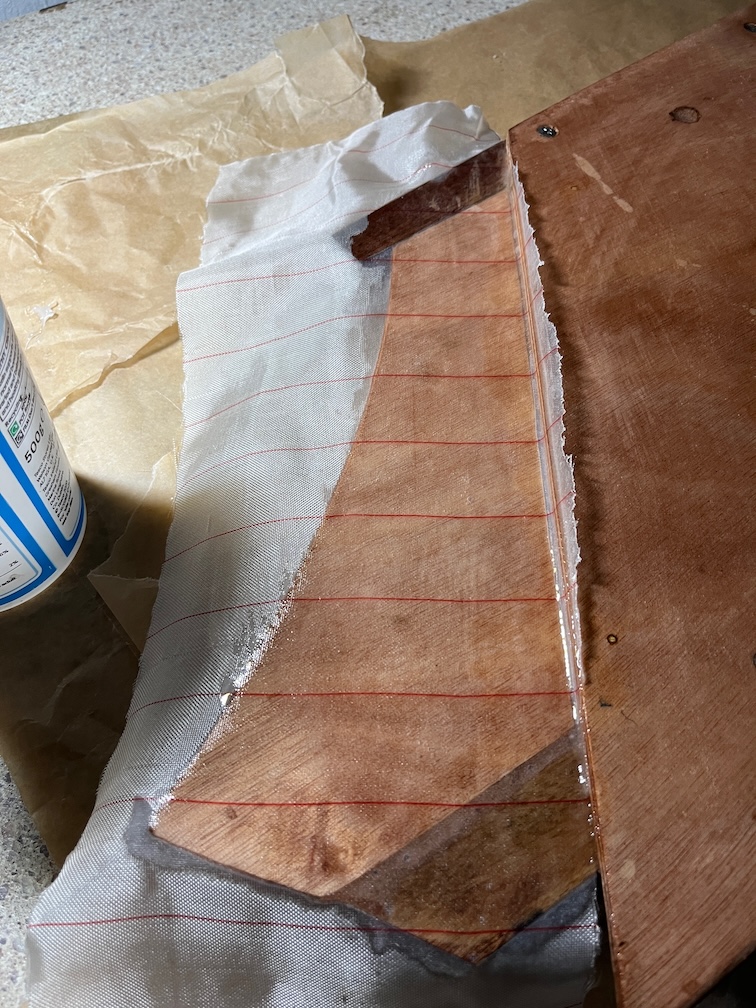 The first layer is unthickened epoxy spread onto the inner side. This is allowed to soak into the wood for a while before the next layer is applied.