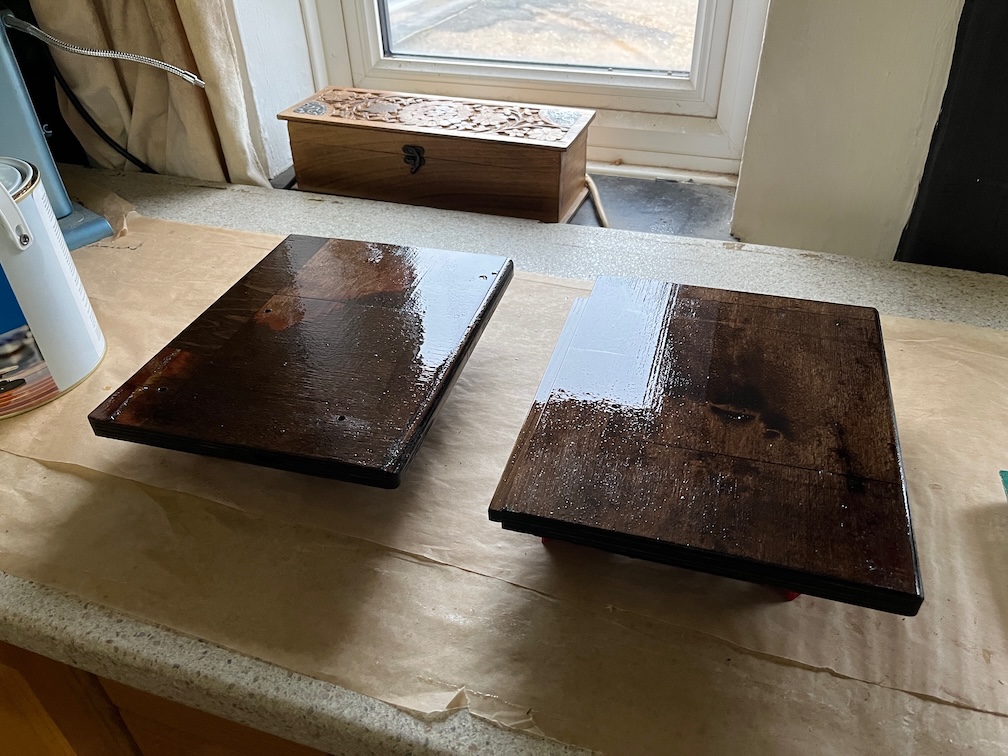 The first small task on the list today was applying a second coat of varnish to the top side of the galley stove boards.