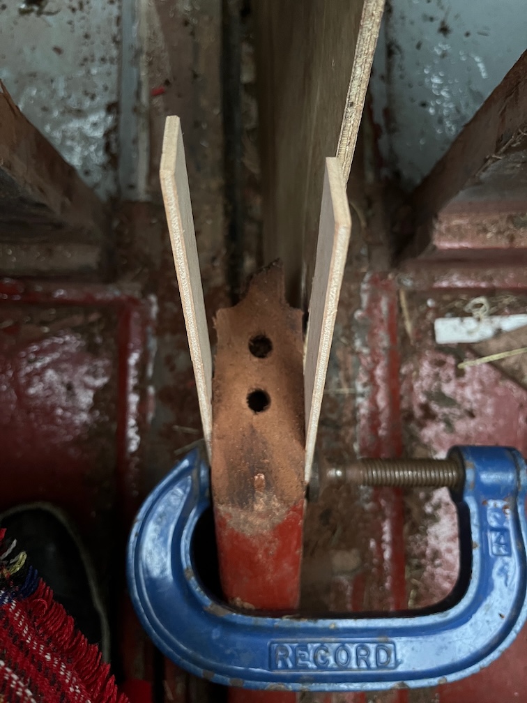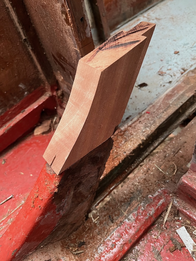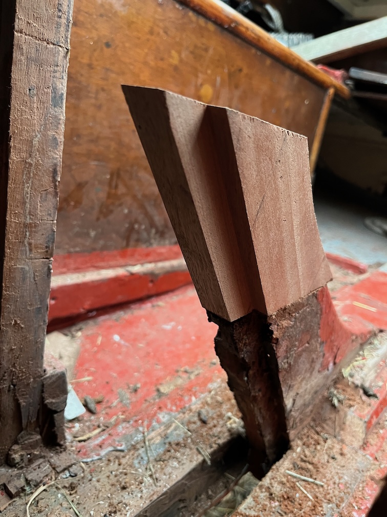 The template was put into the keel, clamped to the top and two thin battens clamped either side of the aft block spanning the old and the new as you can see above. These were to keep the new piece in position and upright as much as possible.