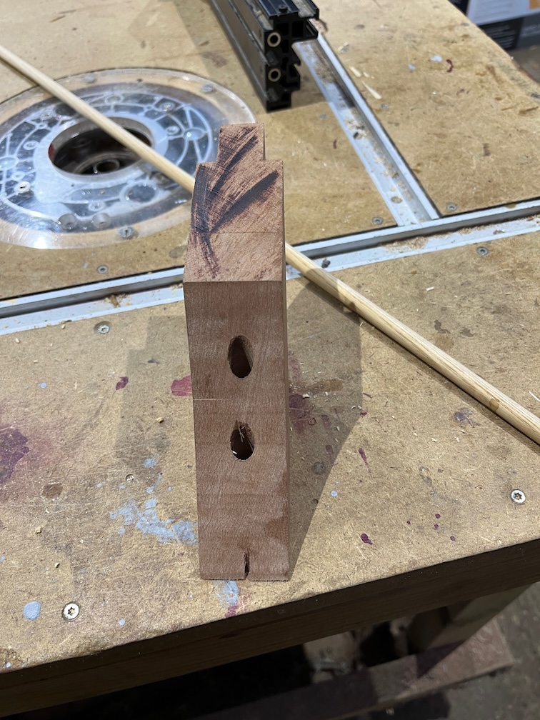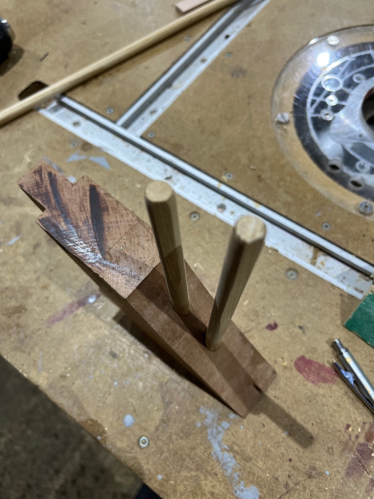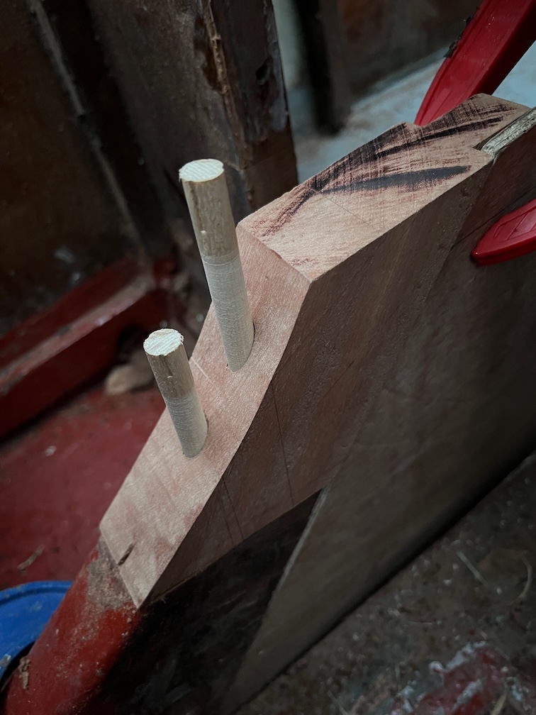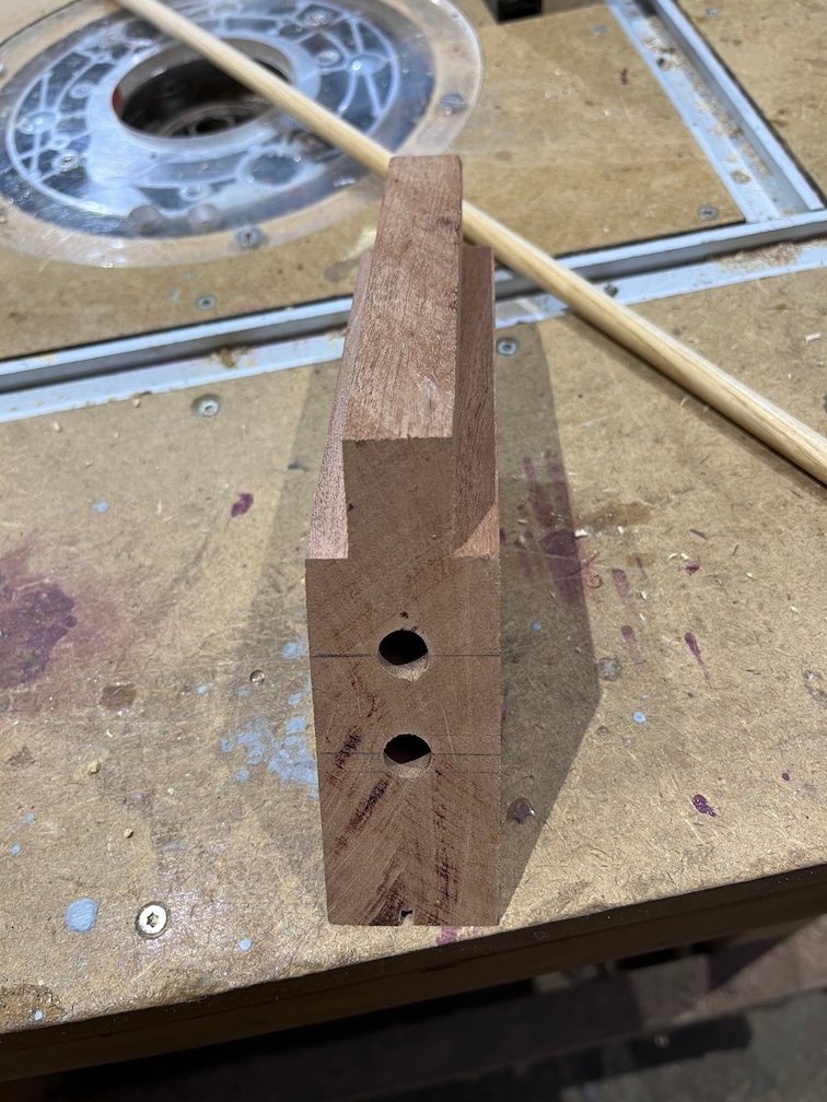 Using a self-centering dowel drilling jig I drilled two 10 mm holes through the new top, both being perpendicular to the bottom.