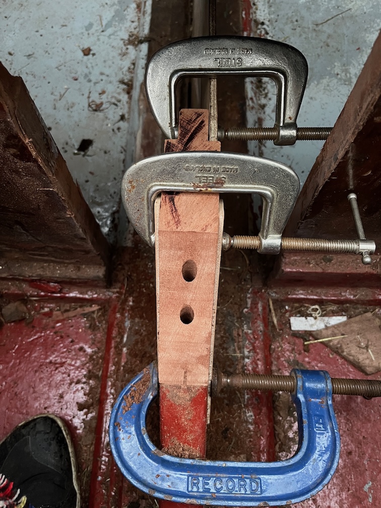 I chose to drill them completely through the block rather than attempt to drill matching holes in the old section by guesswork. This way I can clamp the top piece in place and drill down through the holes and get a perfect fit.