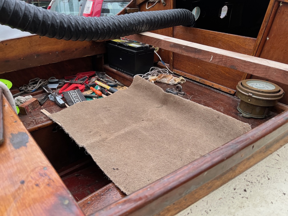 As is now usual the first task before work was to apply some varnish to two small areas in the boat, the back of the new galley locker and the cut side of the forward locker lid.