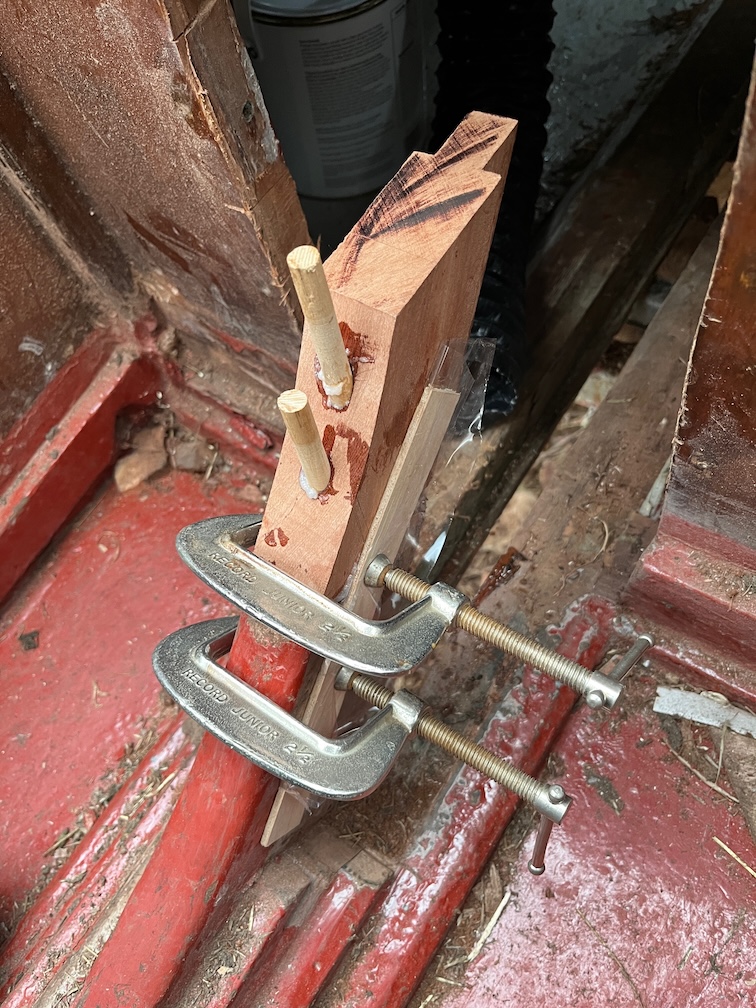 During my morning tea-break I applied neat epoxy to the top of the aft block, now well warmed up, and to the bottom of the new piece, also warmed up by being on the Rayburn all night, then added some thickener to the remaining epoxy, spread some of this onto the bottom of the new piece, and took thickened epoxy, top and pins down to the boat.
