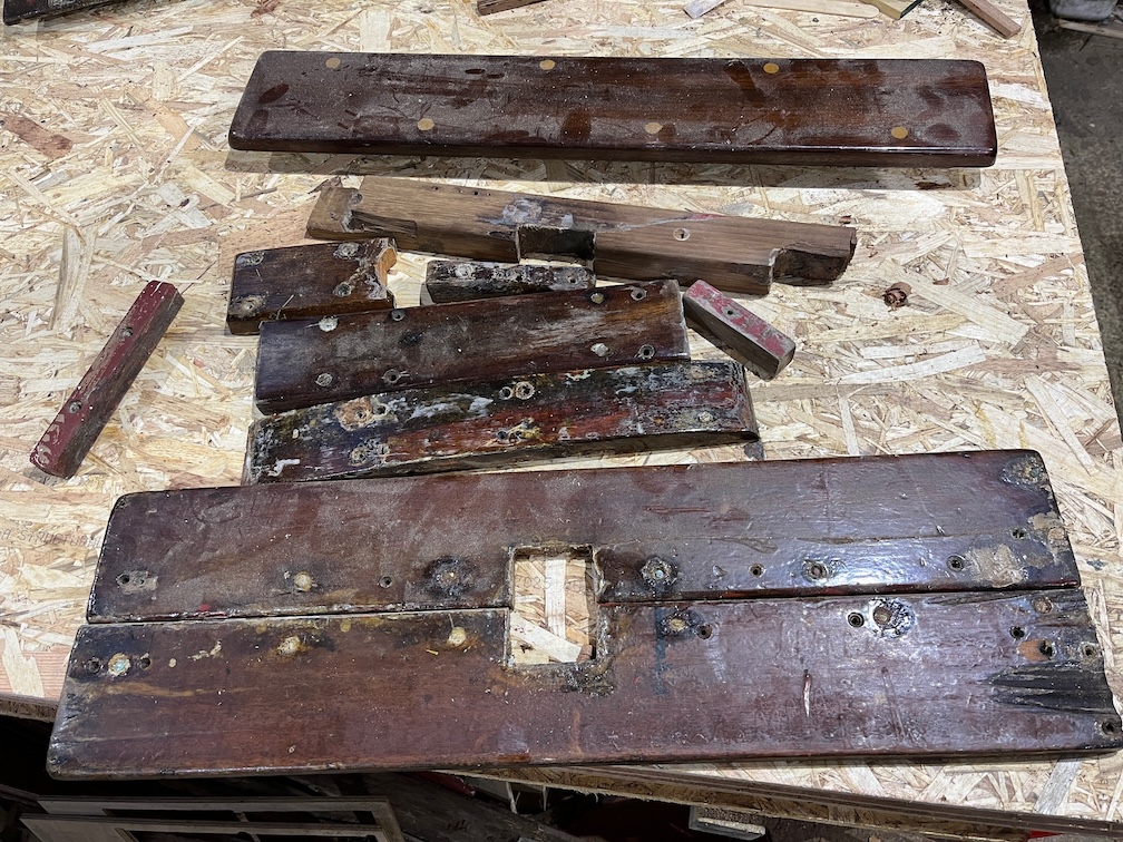 These however needed additional work. Old screw holes were drilled out and plugged in the case of the grey piece, the other pieces need to be dried out, sealed with Clear Penetrating Epoxy Sealer and two of the pieces need to be glued back together.