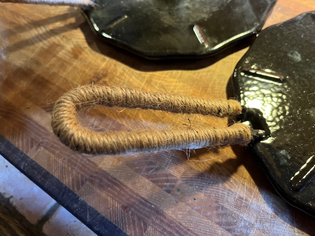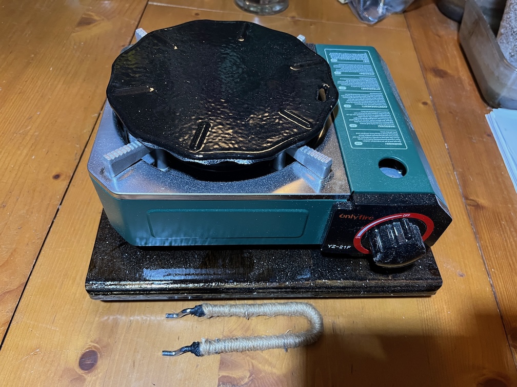 The first small task was to insulate the flame spreader handle. This handle is not left on the spreader when in use but used to remove the spreader when hot. Unfortunately, the bare handle becomes very hot very quickly and without care a burnt hand results. This insulation consists of 6 mm round stove rope threaded onto the handle, glued at the ends with seal adhesive and then, when the adhesive had dried, cotton string was wound over the stove rope creating the handle you see. This resists burning and insulates the handle well enough to be able to use it on a hot spreader without burning skin in the process.