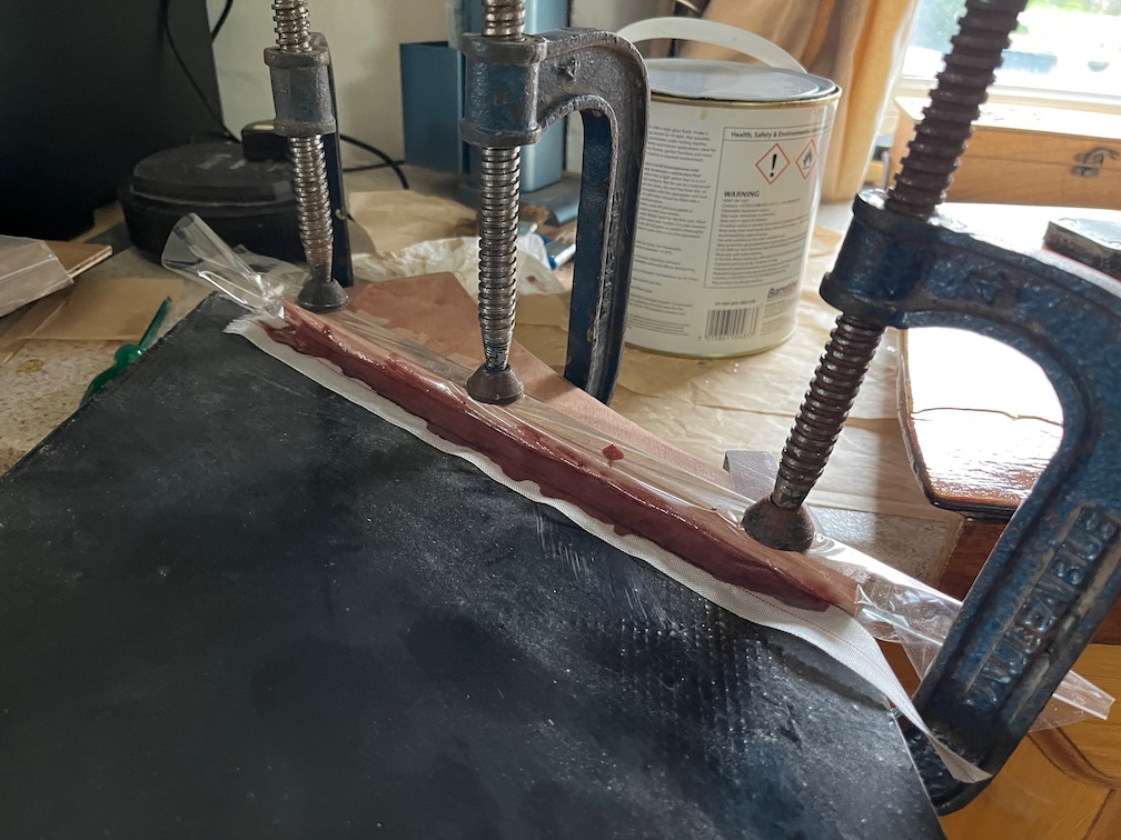 The next task was to repair the port centerplate case side that was damaged yesterday. I have clamped a small batten of wood encased in film up agains the edge where the repair is required.