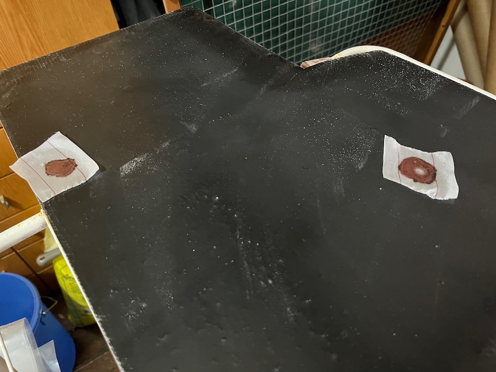 There were also two other spots where the glass mat was slightly exposed and were treated similarly. Once the epoxy has cured all three areas will be lightly sanded to the same level as the surrounding epoxy.