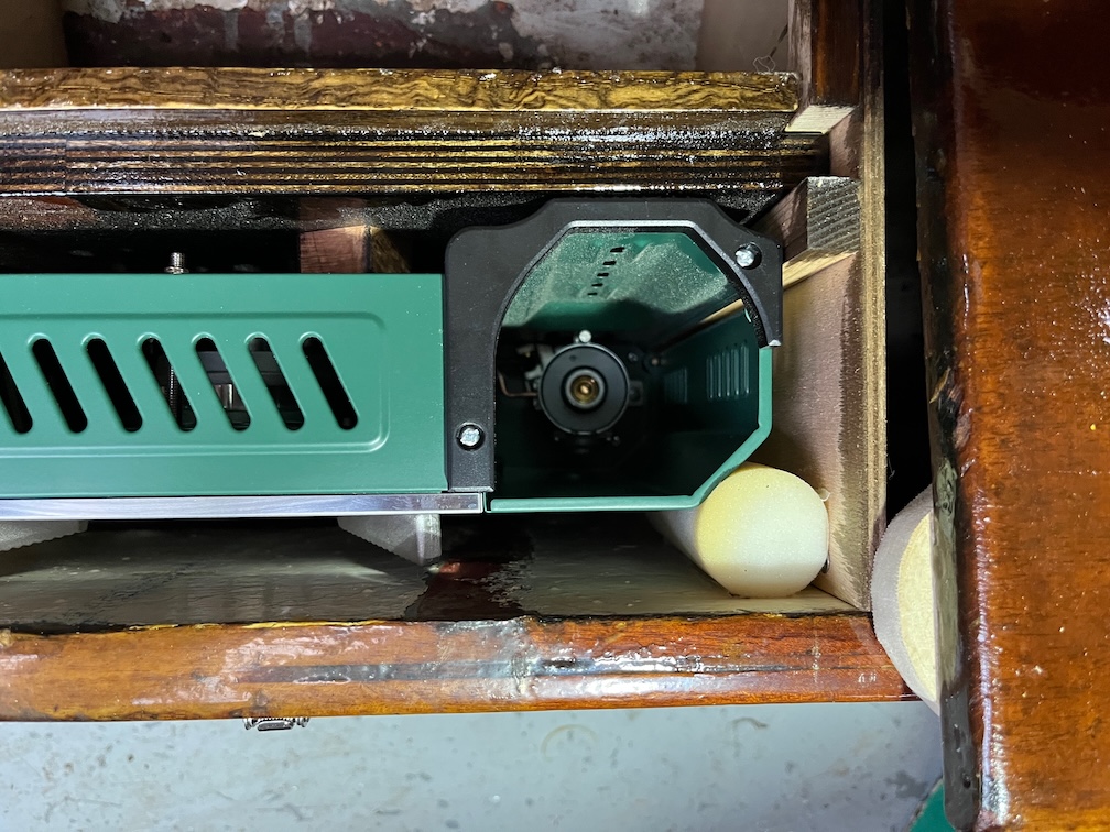 When the stove is stowed the foam roller prevents the lid of the stove opening and closing, going clink against the locker or against the stove itself every time the boat rocks with a wave. I know this from experience of living aboard a sailing boat for ten years. There’s absolutely nothing so annoying as something going clink, clink, clink, clink whilst you are trying to sleep. Whether it be pots, pans, crockery, loose tools, it doesn’t matter, it is infuriating !!!