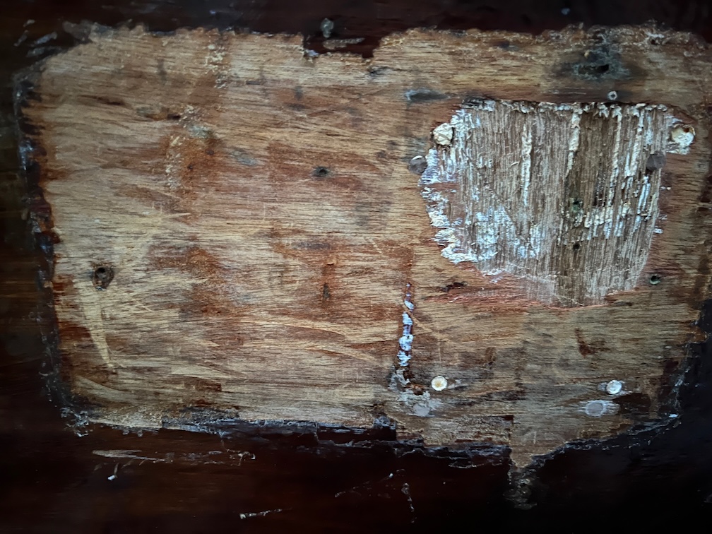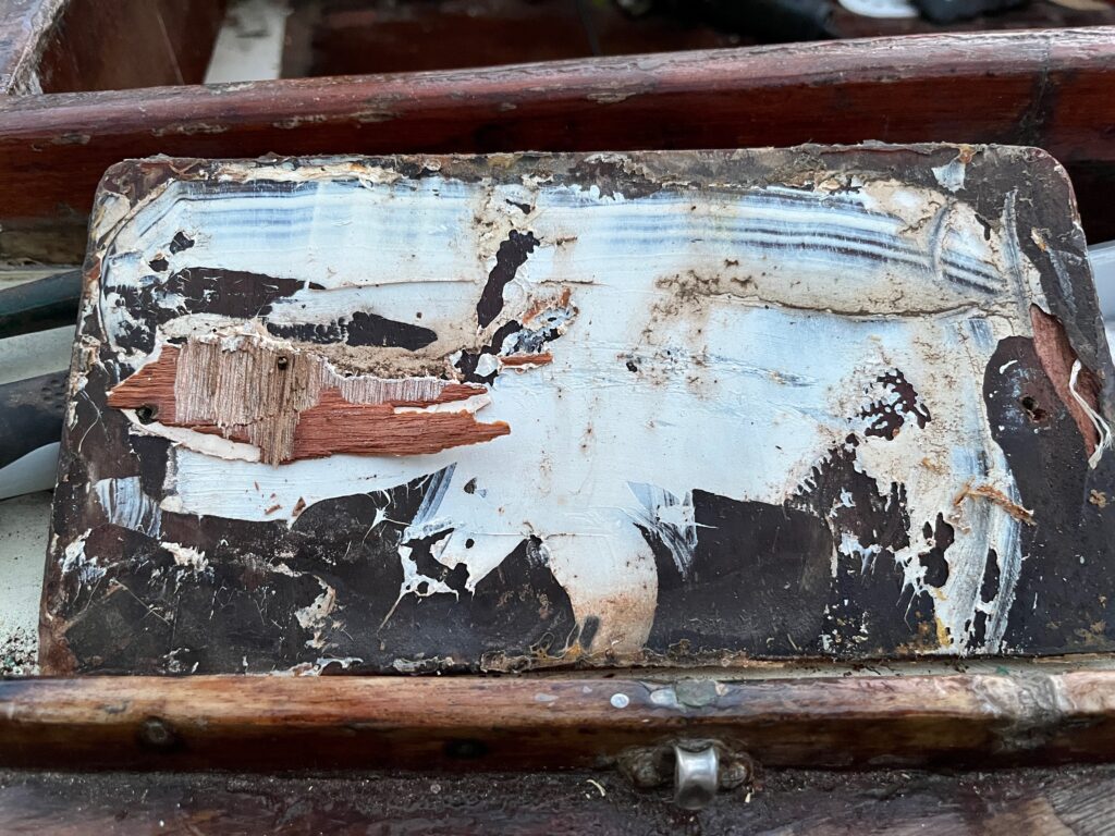 I recall that for the first year that Tony Smith owned Shoal Waters, he mounted what looks like a long shaft seagull outboard motor in the stern and I wonder if these holes and damage were something to do with that. Not that it matters, the thing is how far down the rabbit hole do I want to go with the repair? The simplest and easiest way to deal with this is to fill it with sealant again, a non-adhesive type, since it is under the Maldon sign and will not be noticeable. The correct way to fix this is to insert a graving piece by cutting a shallow recess where the damage is now, I’d make this 6 mm deep as that is the thickness of the marine plywood I have, then cut out a piece of plywood that fits into the recess and glue it in.