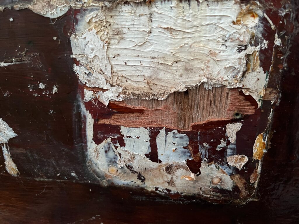 This is the back of the sign and you can see that some of the transom has pulled off with the sign. This sign is marine plywood and was glued in place with a sealer adhesive and a very good one at that.Too good, as it turns out.
