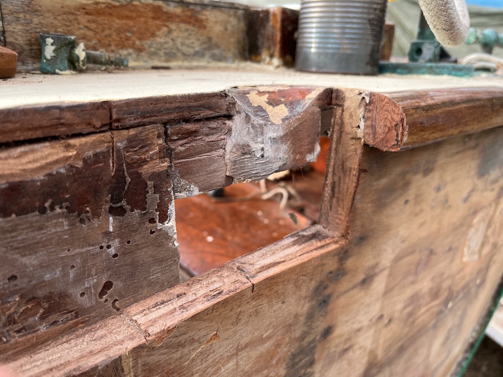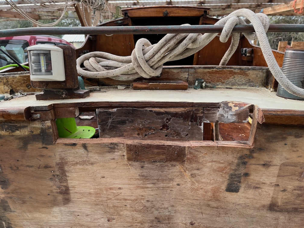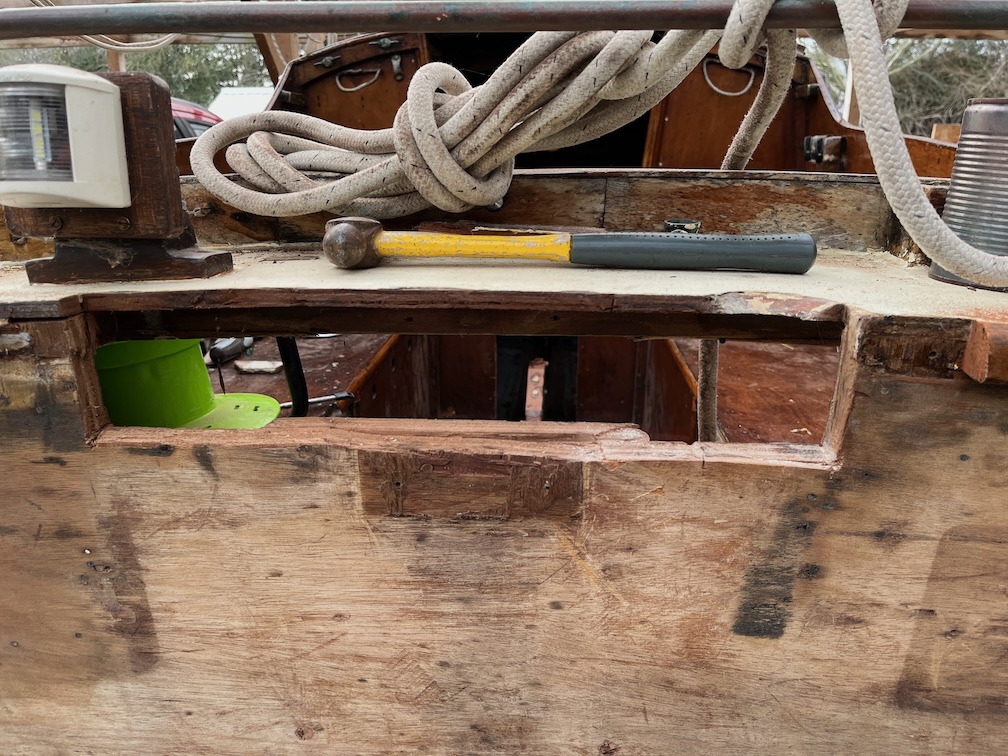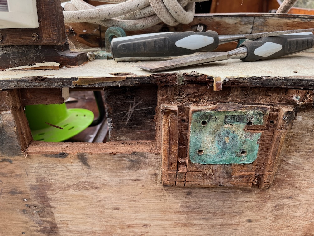 I was surprised to find that the damage was quite extensive.You can see the area that was marked as needing a graving piece, I’ve had to cut entirely through the transom. You can also see that the rotten/damaged wood extends into the aft deck and down behind the backing pad upon which the rudder gudgeon was fixed. That meant that the pad had to come off and in the process of removing the rudder fitting I found that only the lower two screws were holding. The upper two came out without needing to unscrew them.