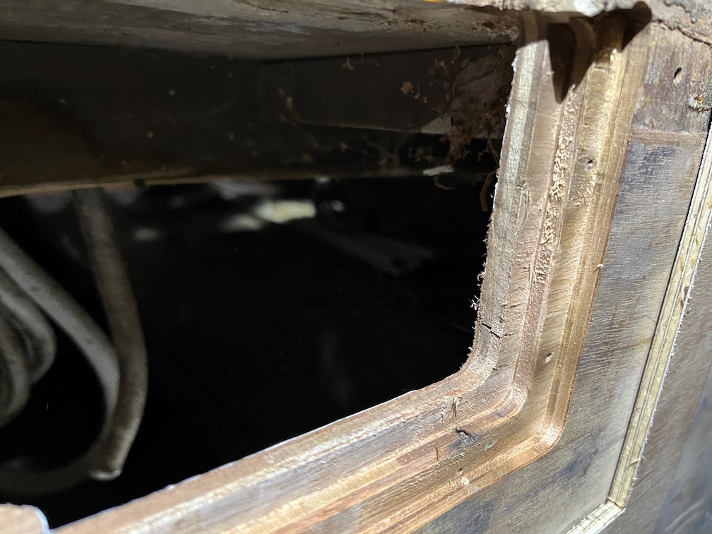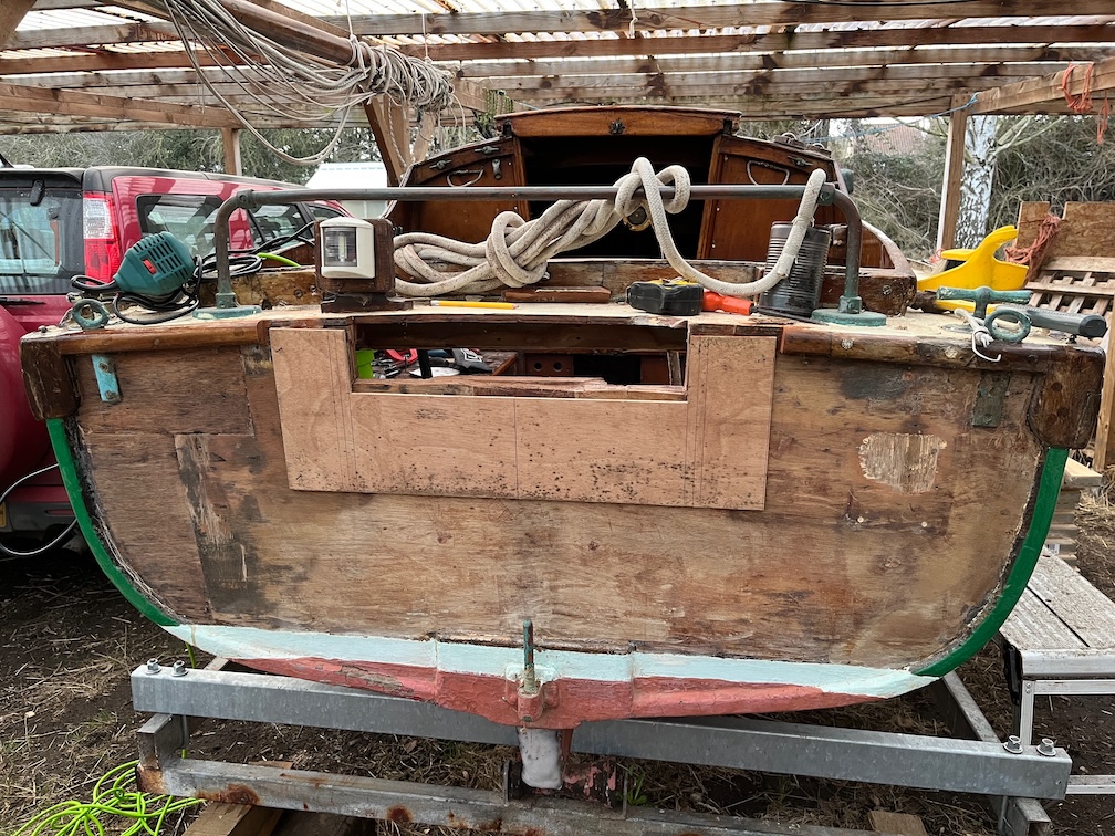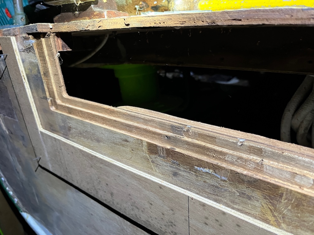 The repair is not difficult despite looking quite extreme. I’ll cut a plywood router guide and nail that to the transom about 5mm out from the hole and then use a router follower bit to make the edges of the hole square to the face of the transom and square to the sides and bottom of the hole. Then I shall make another plywood template that cuts a hole about 10 mm wider and taller than the hole and remove two thirds of the thickness of the edges of the hole. I’ll repeat this once more such that the edges of the hole are stepped instead of straight. The hole will then be filled with three layers of plywood with each piece filling one of the steps.