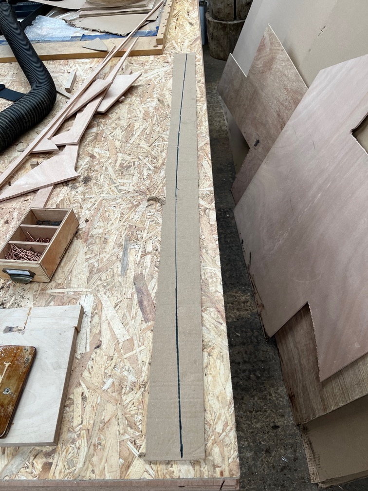 So, after the morning varnish application, during a tea break, I made a cardboard template for the curve of the aft deck.