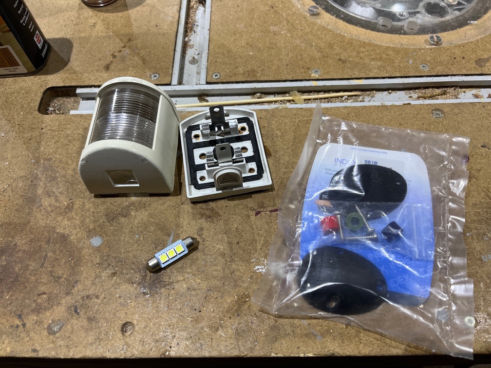 This is another thing that needs a little bit of attention, the aft navigation light. It was screwed to the support with steel (rusted) screws and the cable won’t go through either the hole in the back of the light, nor the hole in the deck, due to the crimp connectors. So, I shall fix both of these issues so that I can put in the deck gland.