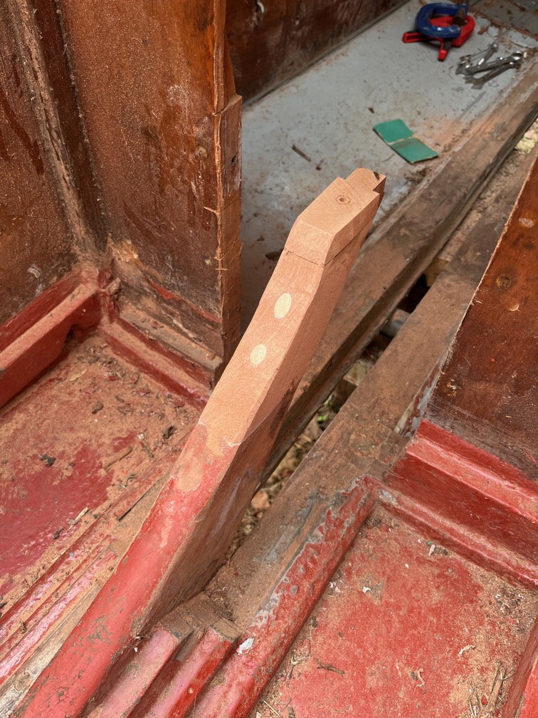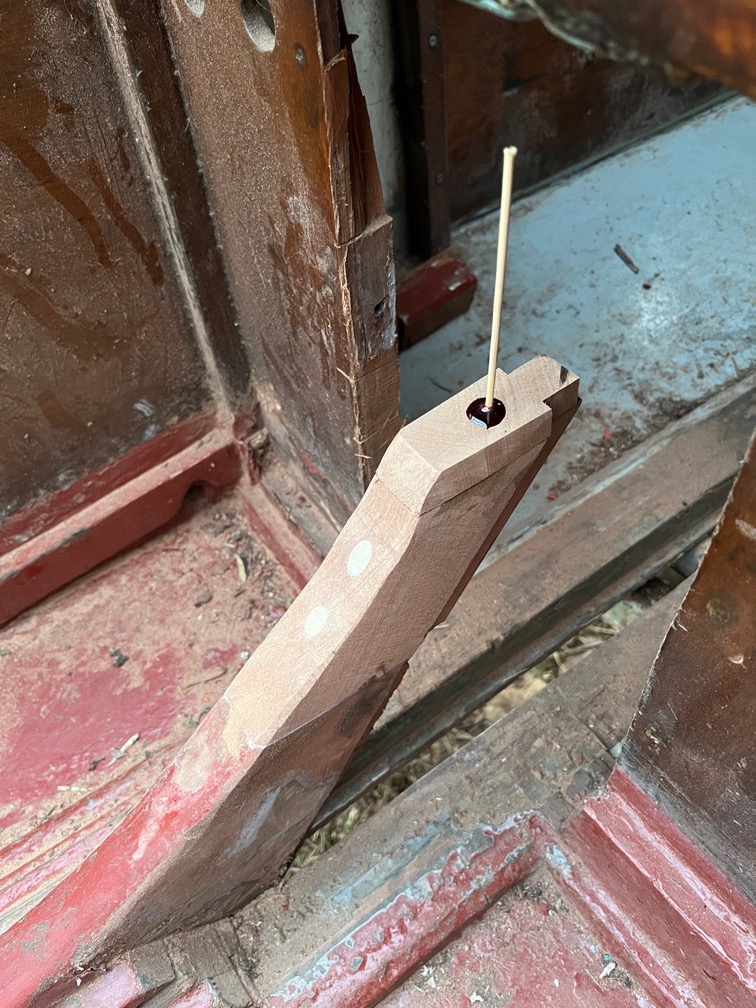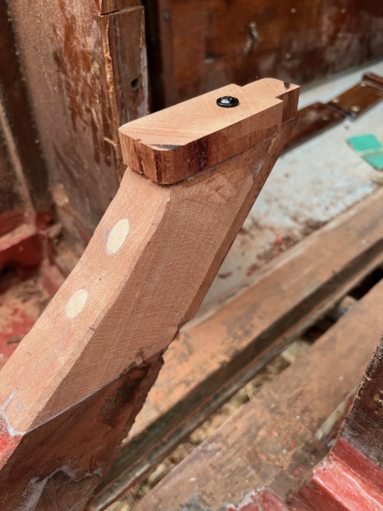 This means that not further work on the case can be carried out until the new piece of wood on the aft block is firmly stuck and then shaped and the epoxy on the cases has cured.