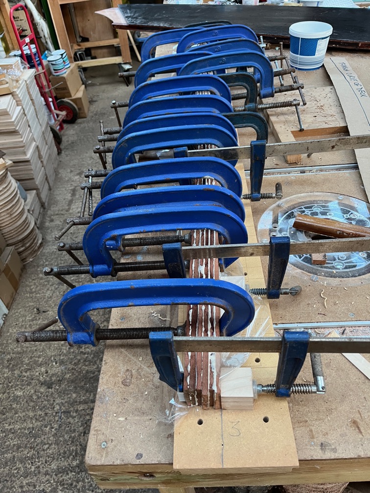 Like this. The jig was covered in film to prevent the laminates from being glued to the jig and the laminates covered in glue on both sides except for the outermost ones which only had glue on one face. These were stacked and put into the jig and clamped in place.