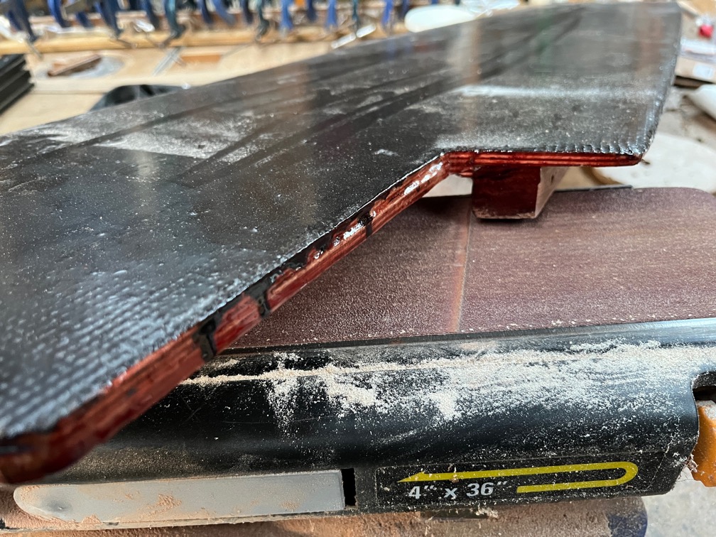 Once the glue had set enough to withstand some strong sanding, I took a sanding disk on an angle grinder and the belt sander to shape the aft block.